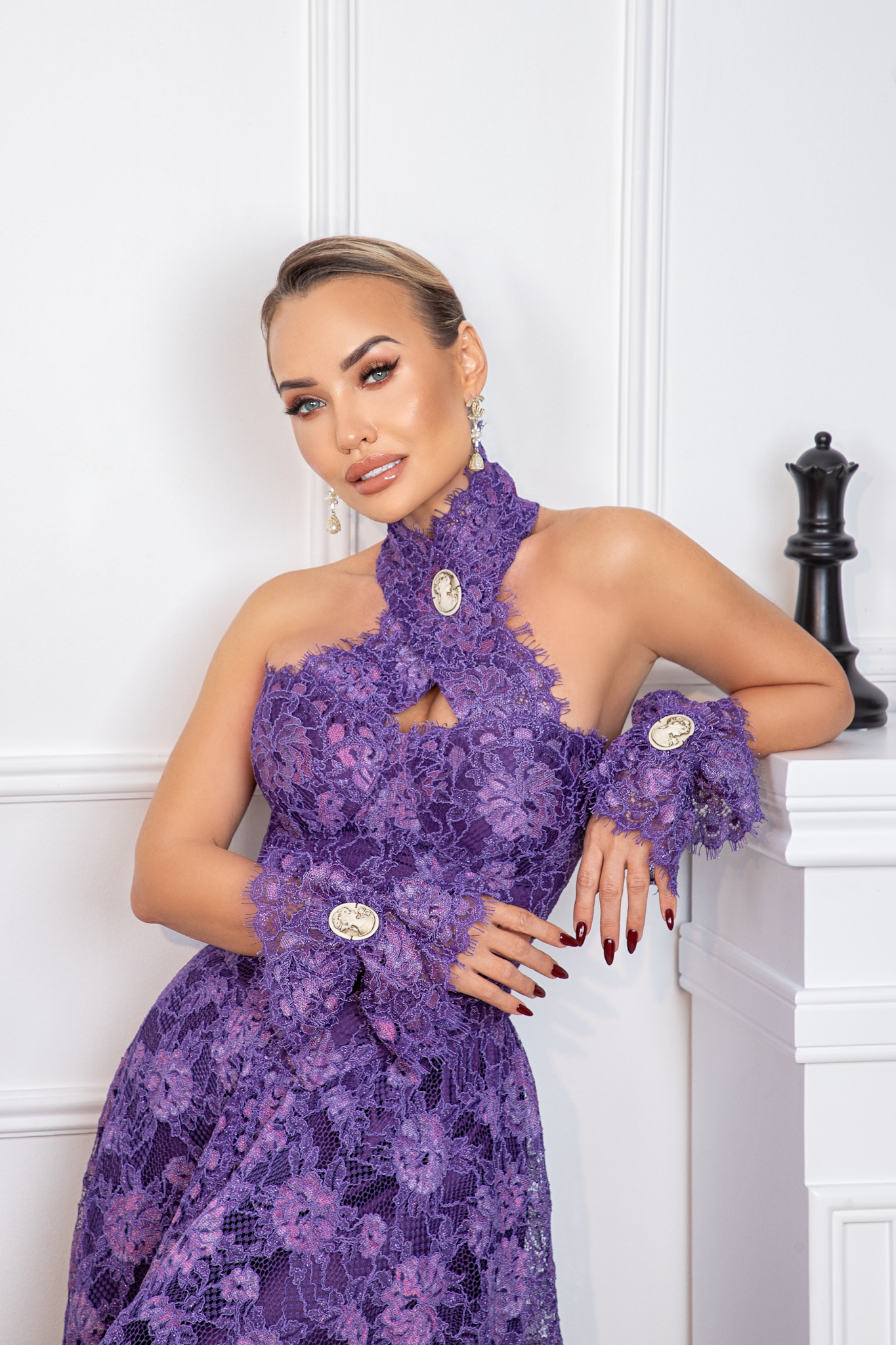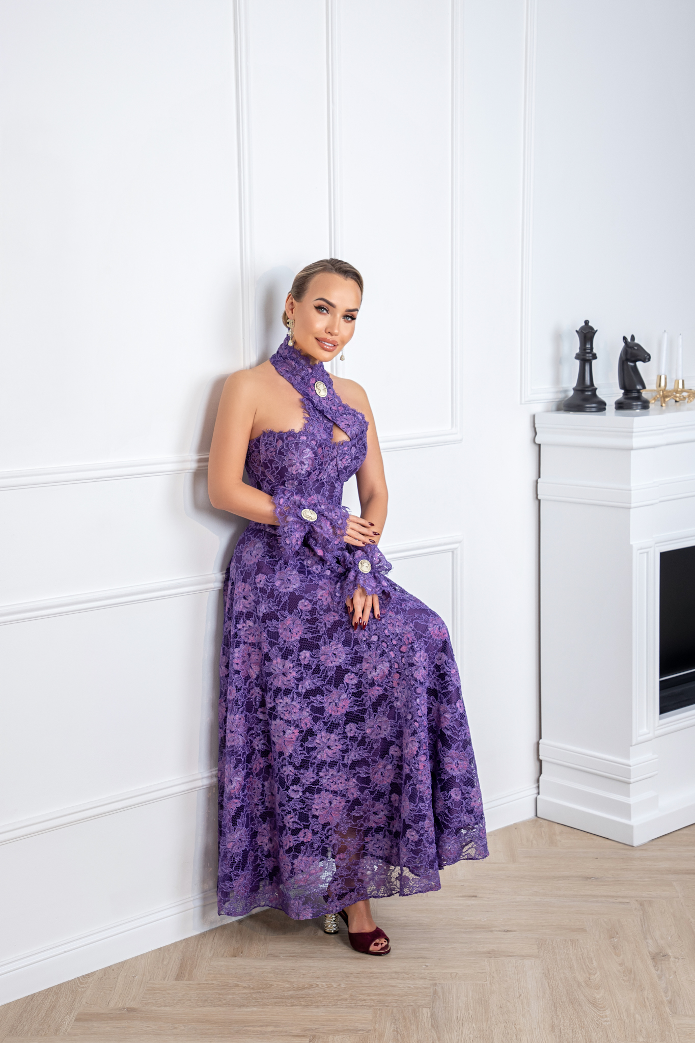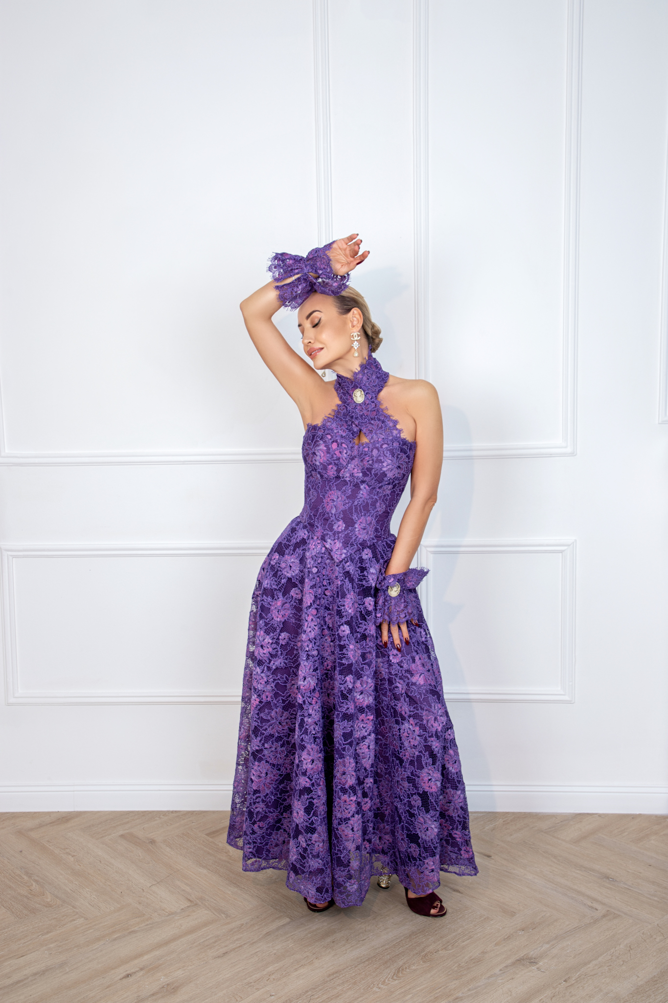 A masterpiece of opulence, the Amethyst Royale Gown is crafted from the finest Italian lace, enveloping the silhouette in a symphony of regal purple hues. The sculpted halter neckline, adorned with antique-inspired medallions, adds a touch of aristocratic charm, while delicate lace gloves complete the look with timeless sophistication.