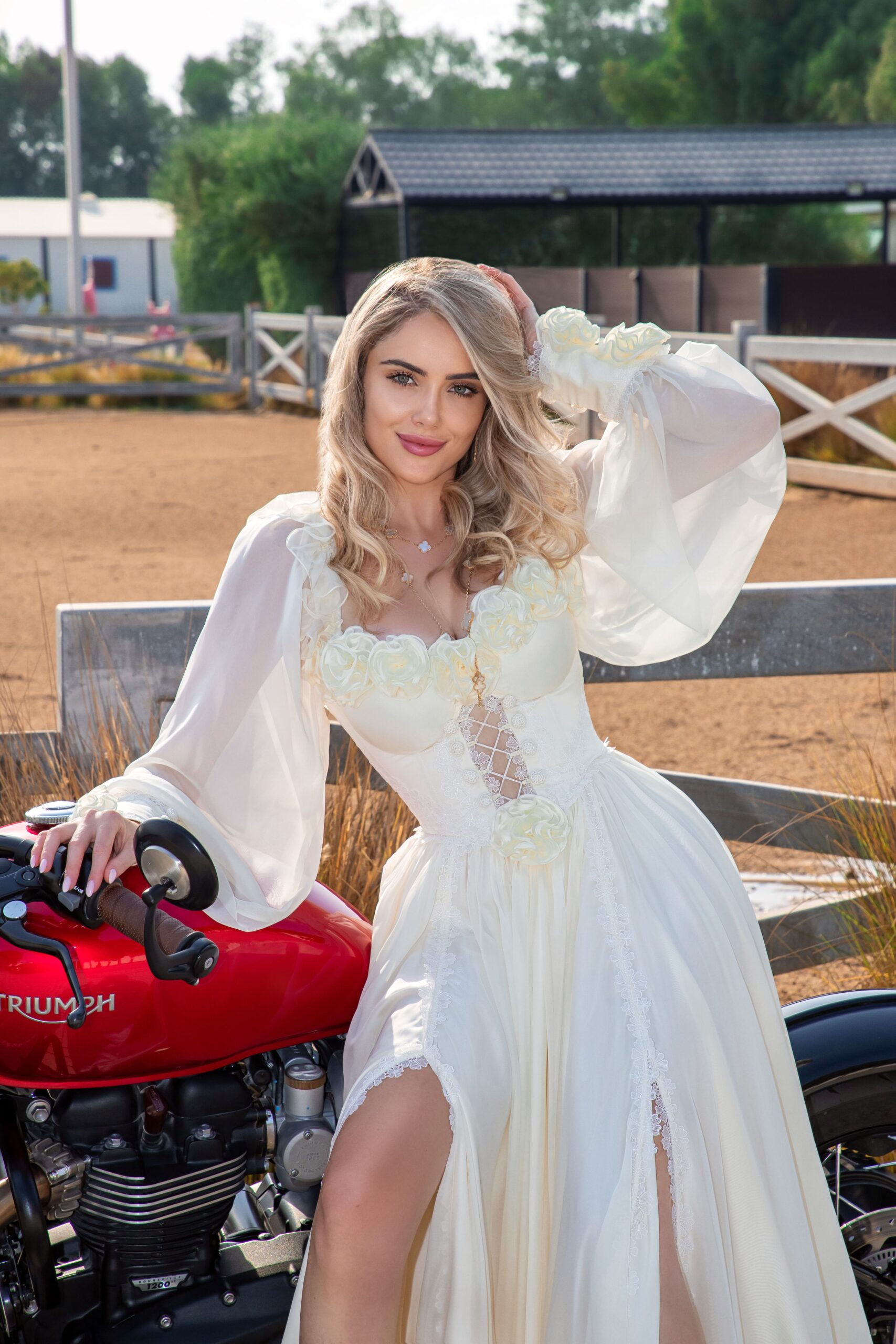 An ethereal ivory gown adorned with delicate floral appliqués and romantic lace-up details. Flowing chiffon sleeves and a cascading skirt create a sense of timeless grace, making the Athena In Bloom Gown a poetic blend of romance, femininity, and couture craftsmanship.