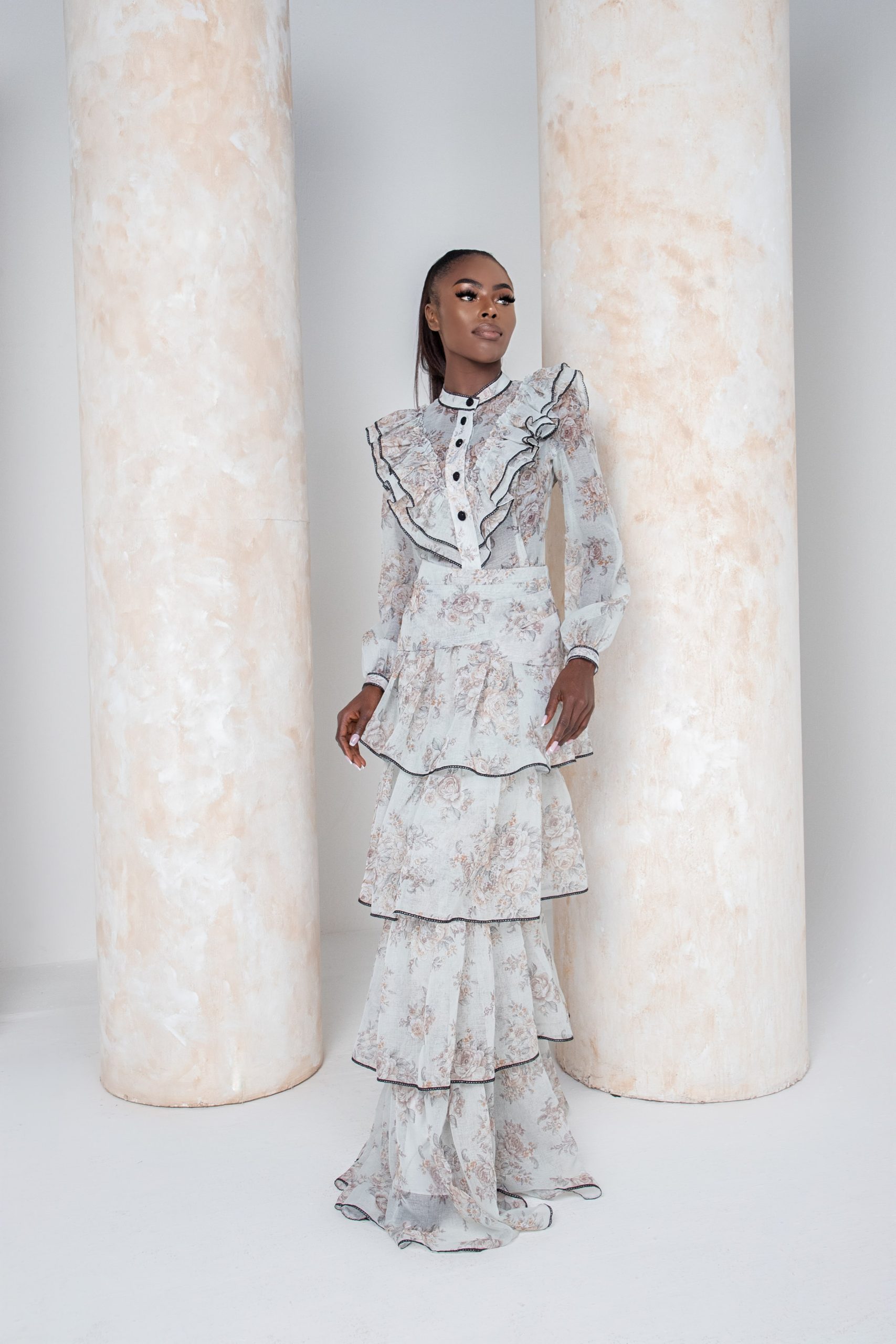 Feel the whisper of the wind as you twirl in this enchanting ensemble. The skirt, with its layers of fabric and delicate black lace details, dances with every gust, exuding grace and charm. Paired with a shirt adorned with intricate black crochet buttons, each one a testament to craftsmanship and style. And the pièce de resistance? A vintage corset, a marvel of design that can be worn separately, adding a touch of old-world glamour to any outfit. Let the wind carry you away as you embody the essence of timeless elegance.