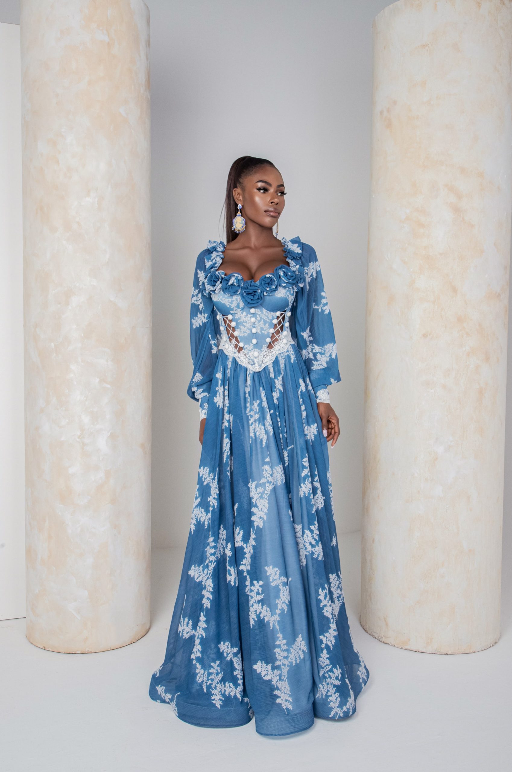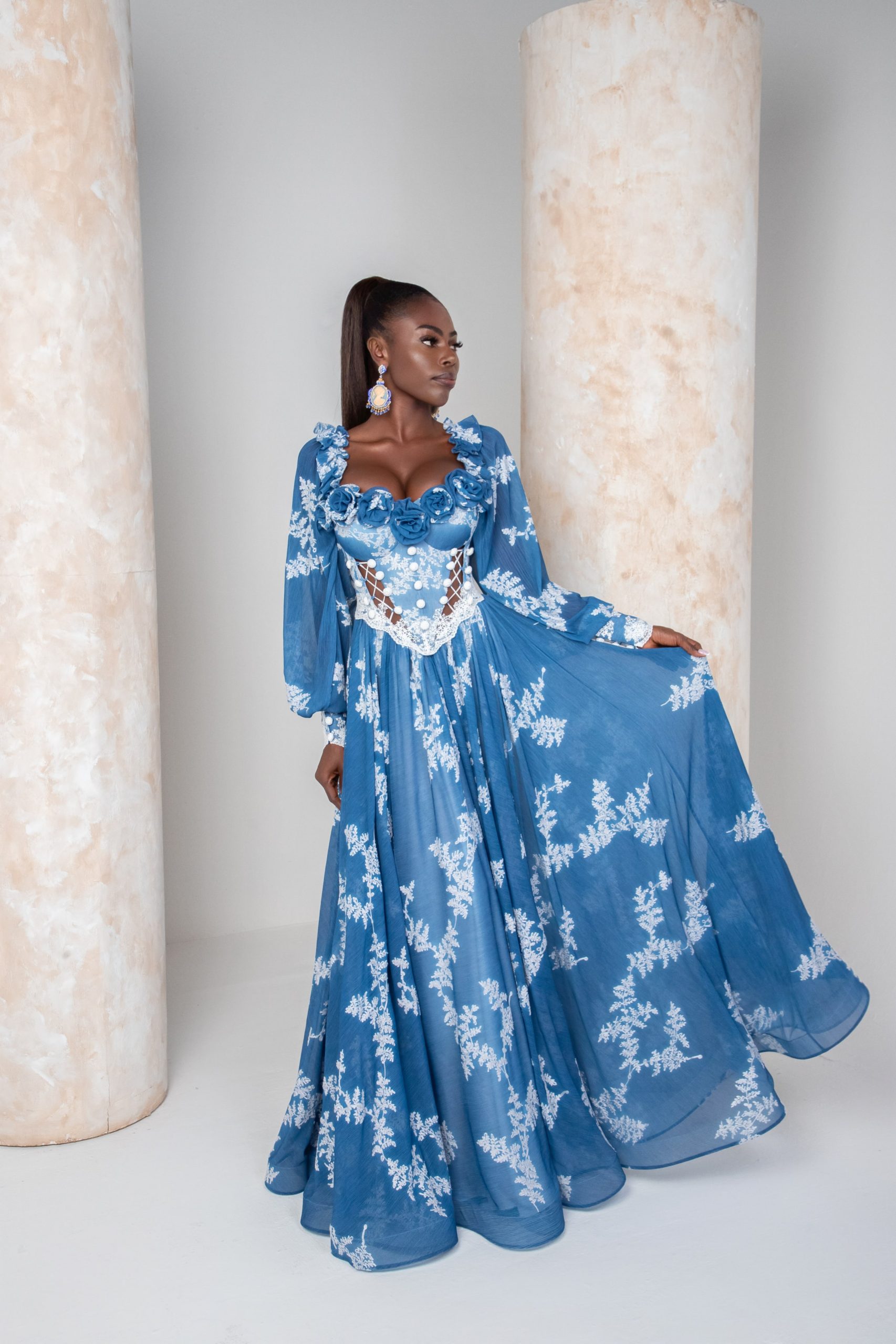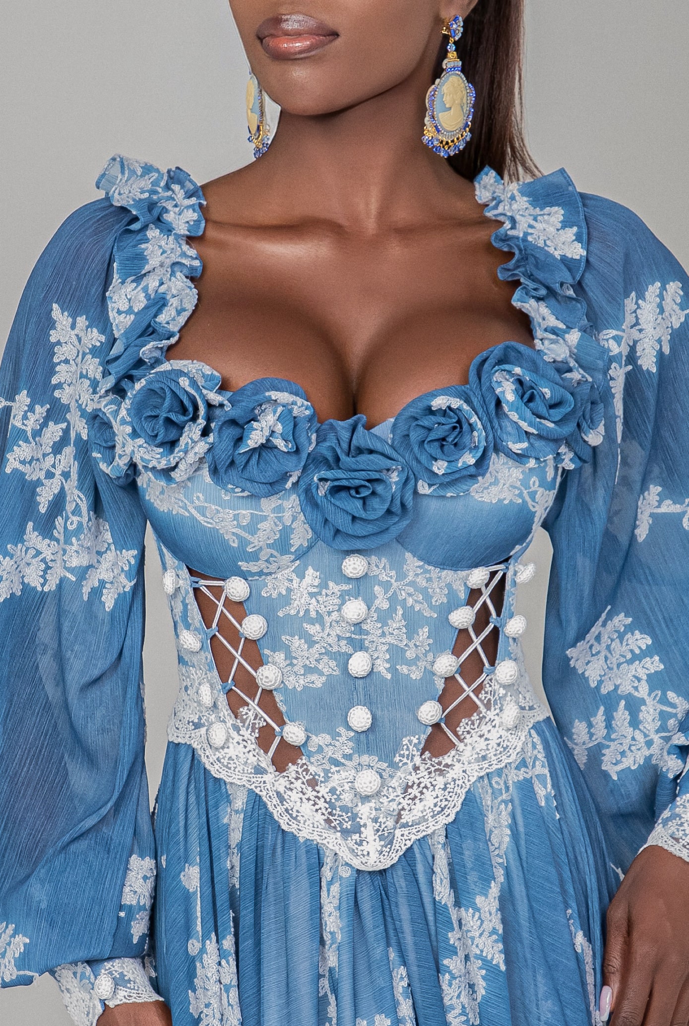 In the realm of dreams, where magic weaves through every thread, there exists a gown beyond compare. Imagine a dress fashioned from the ethereal fabric of wrinkle chiffon, each fold whispering secrets of ancient forests and hidden glens. Adorned with delicate floral cotton embroidery, the gown blooms with the enchantment of a fairy’s touch. Its corset, a masterpiece of craftsmanship, is embellished with crochet buttons that gleam like captured stardust. Handmade roses grace the cups, their petals spun from moonlight and starshine. And in the depths of the ocean’s embrace, the gown finds its hue—a deep, mesmerizing blue that mirrors the mysteries of the midnight sea. But the true magic lies in its closure, for no ordinary fastening would suffice. Instead, silken strings entwine like spells woven by the hands of sorcery, ensuring a fit as perfect as destiny itself. In this dress, one becomes not merely a wearer, but a character in the most wondrous of tales, where fantasy and reality dance in harmonious splen