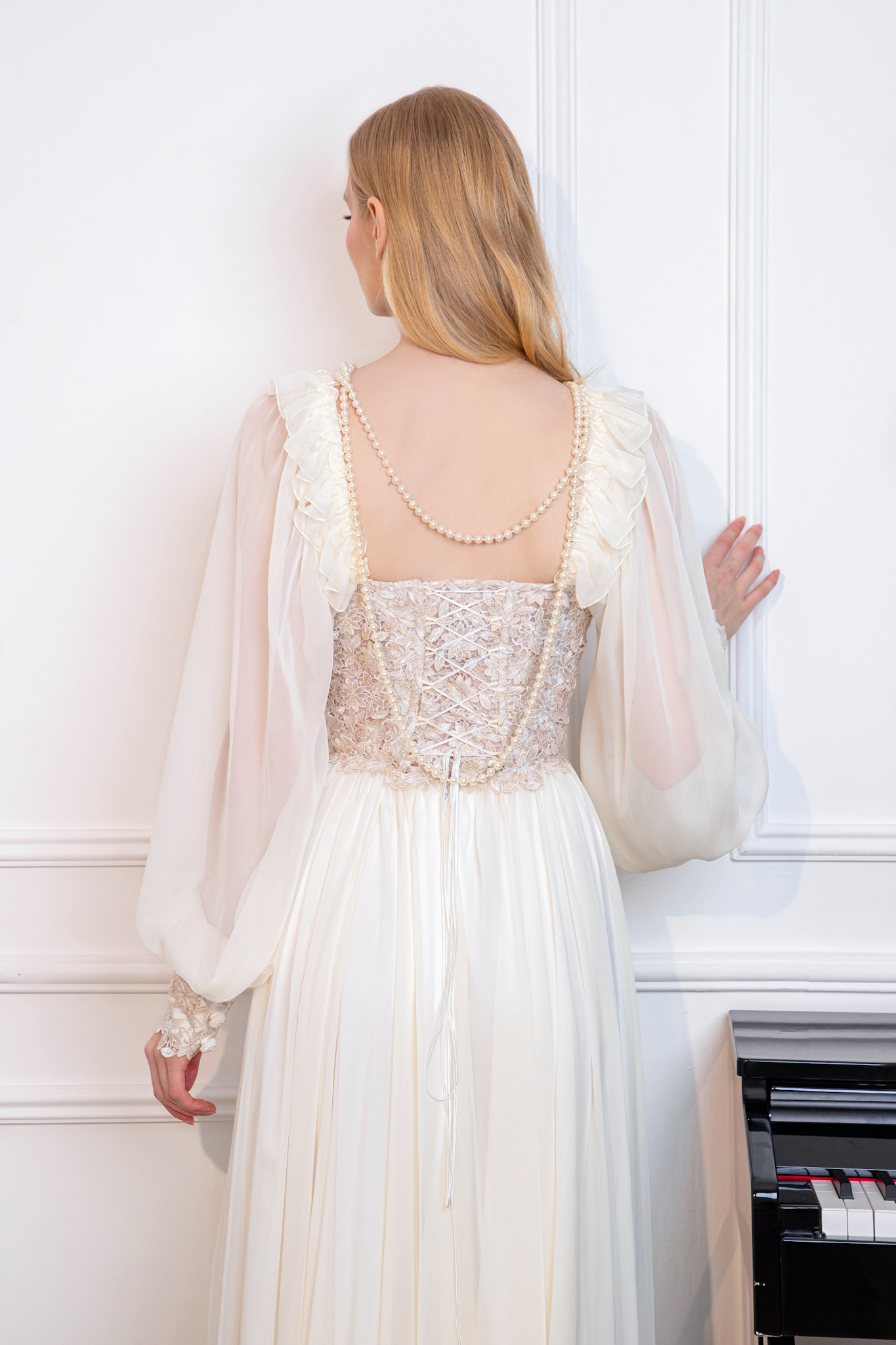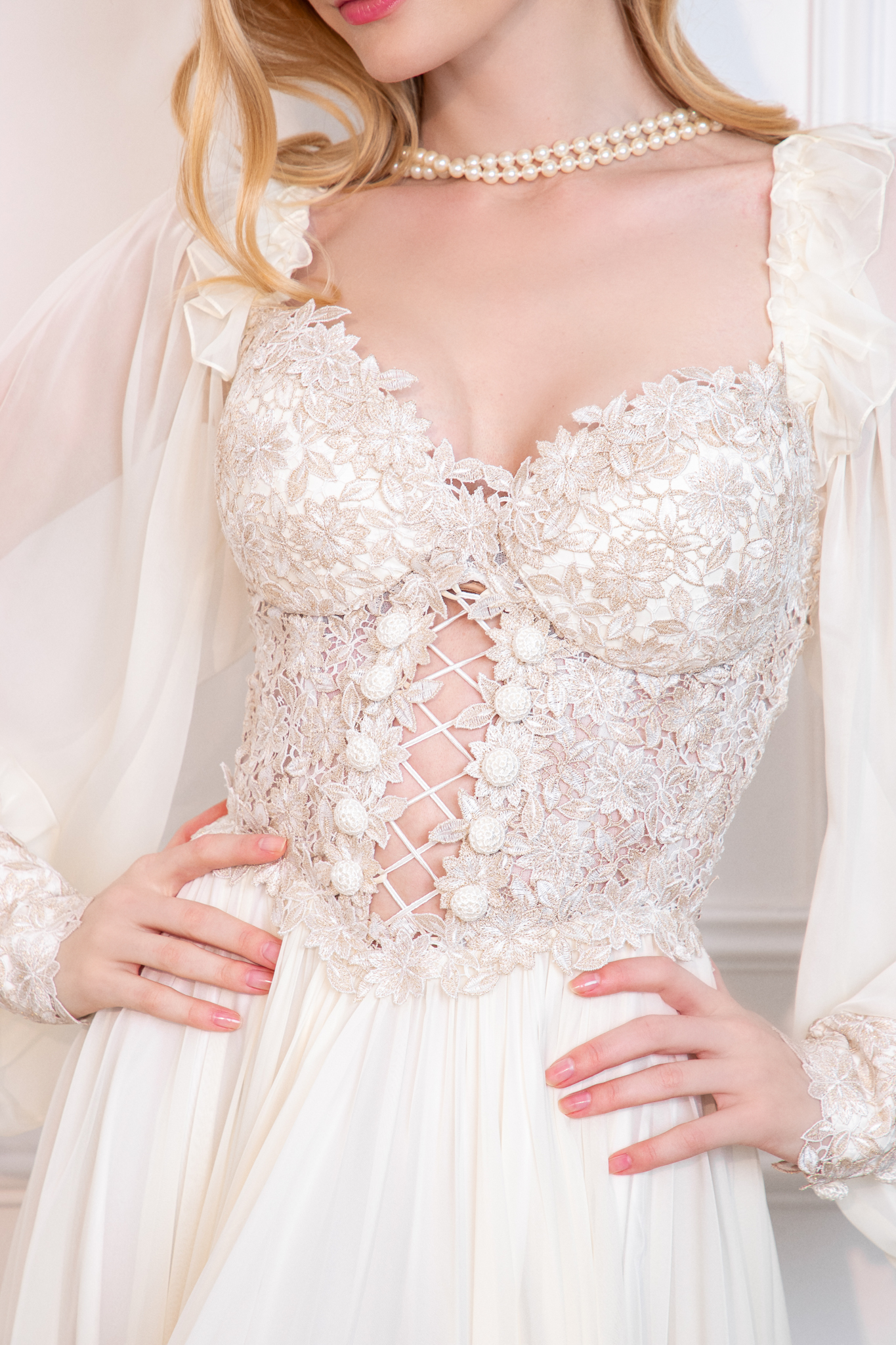 A dress born from the golden light of enchanted realms. Delicate gold lace weaves through soft cream chiffon, flowing like whispered secrets of heaven’s gardens. Each movement feels like a dance among celestial blossoms, where magic lingers in every thread. A creation for those who carry the grace of a fairy’s soul.