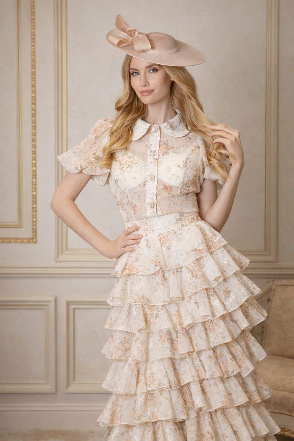 A romantic tiered gown in a soft champagne floral print, designed to move like a dream. The sheer short sleeves and delicate collar bring a vintage grace, while the cascading ruffles sculpt an elegant silhouette from waist to hem. Light, feminine, and unforgettable—made for garden celebrations, soirées, and timeless moments.