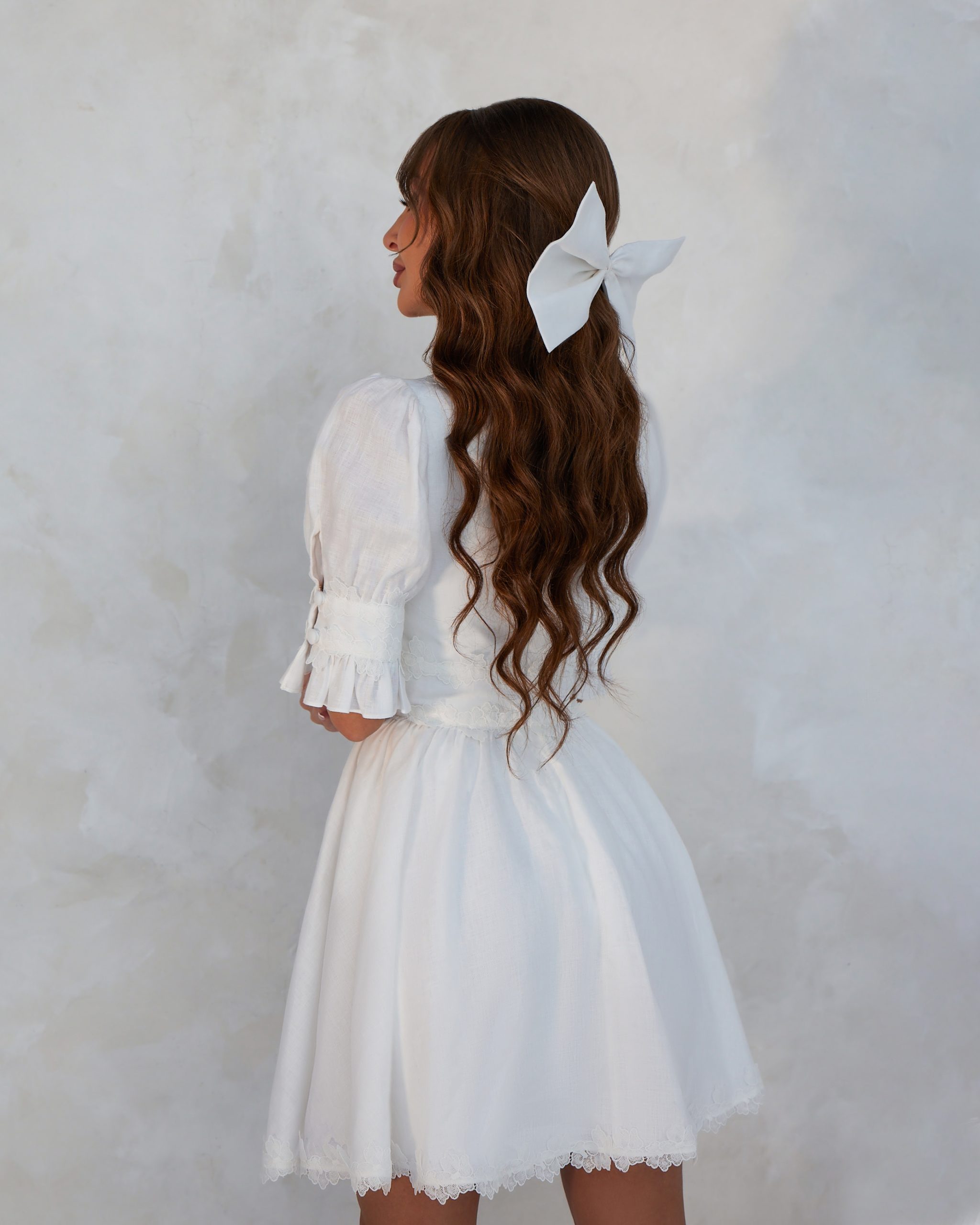 Make your life a fairy tale. Design your dreams and wear our white linen dress full of love and flower laces. A playful dress with a deep neckline, voluminous puffy sleeves and most beautiful flower laces. An elegant and girly sweet silhouette.
