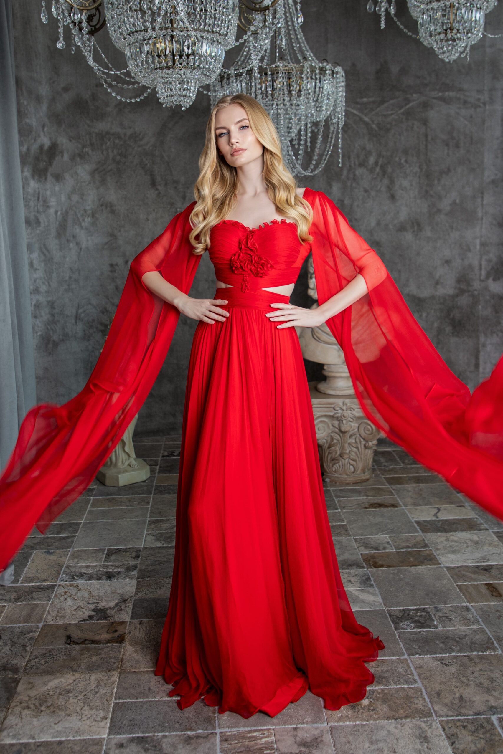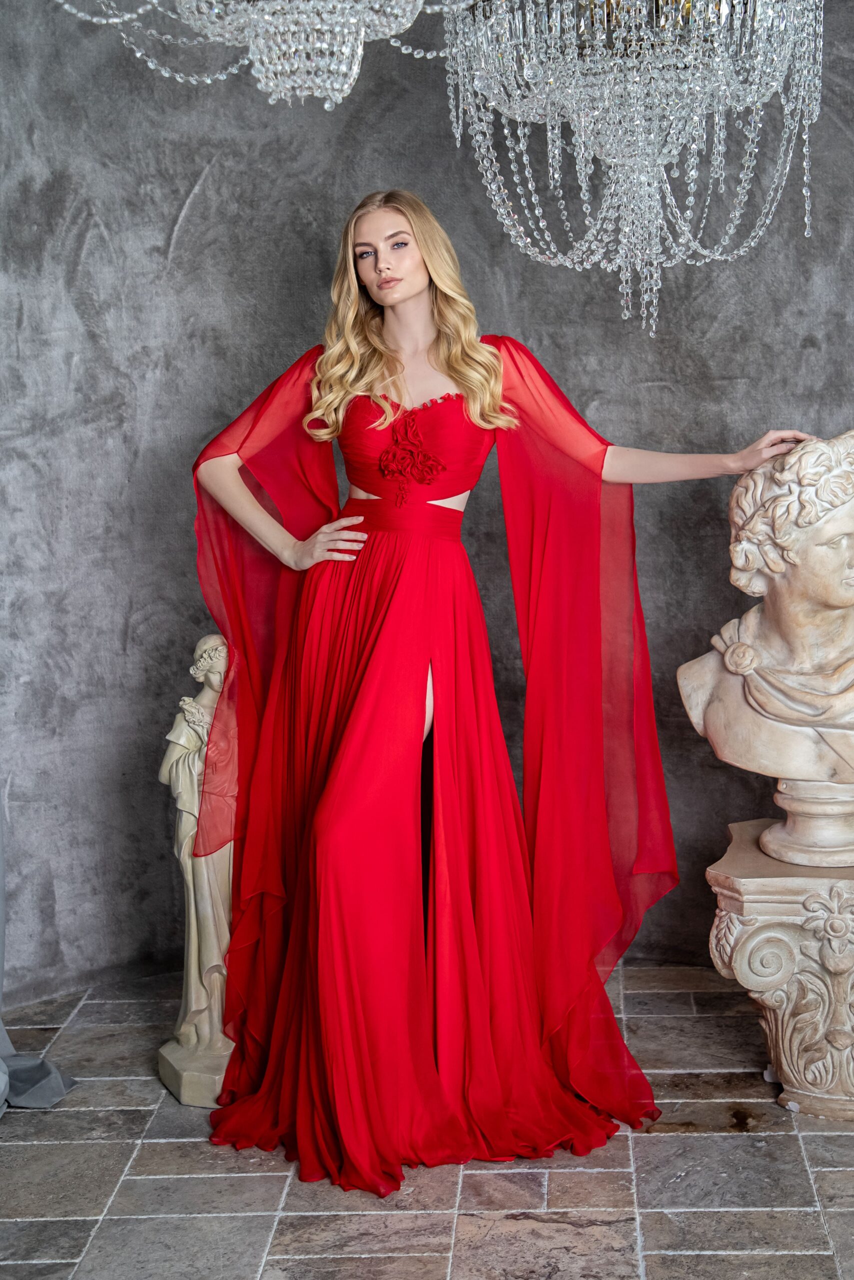A divine symphony of elegance and fire — this flowing red chiffon gown unveils the spirit of a goddess. Draped with ethereal capes and a daring slit, it celebrates confidence, passion, and timeless femininity.