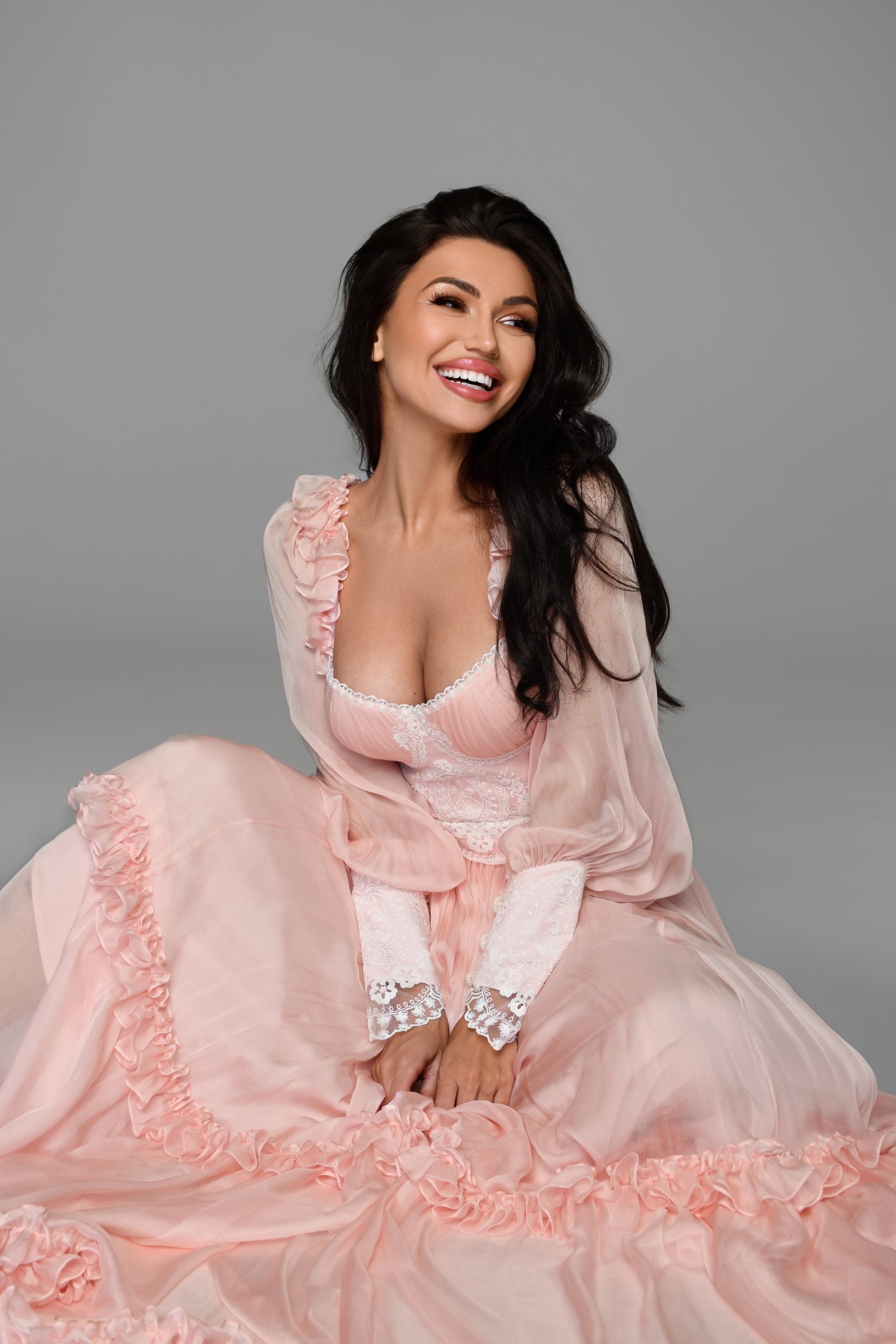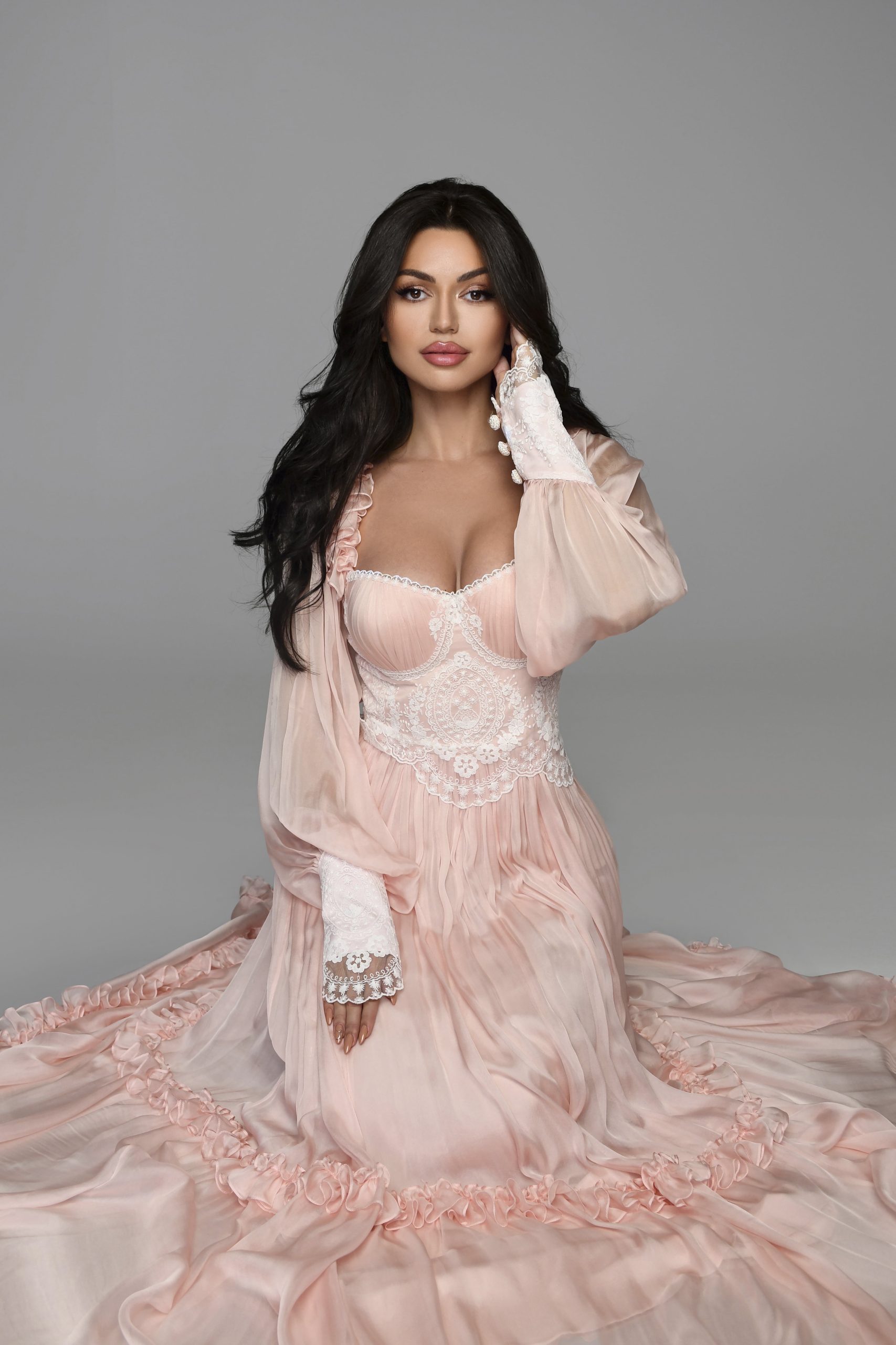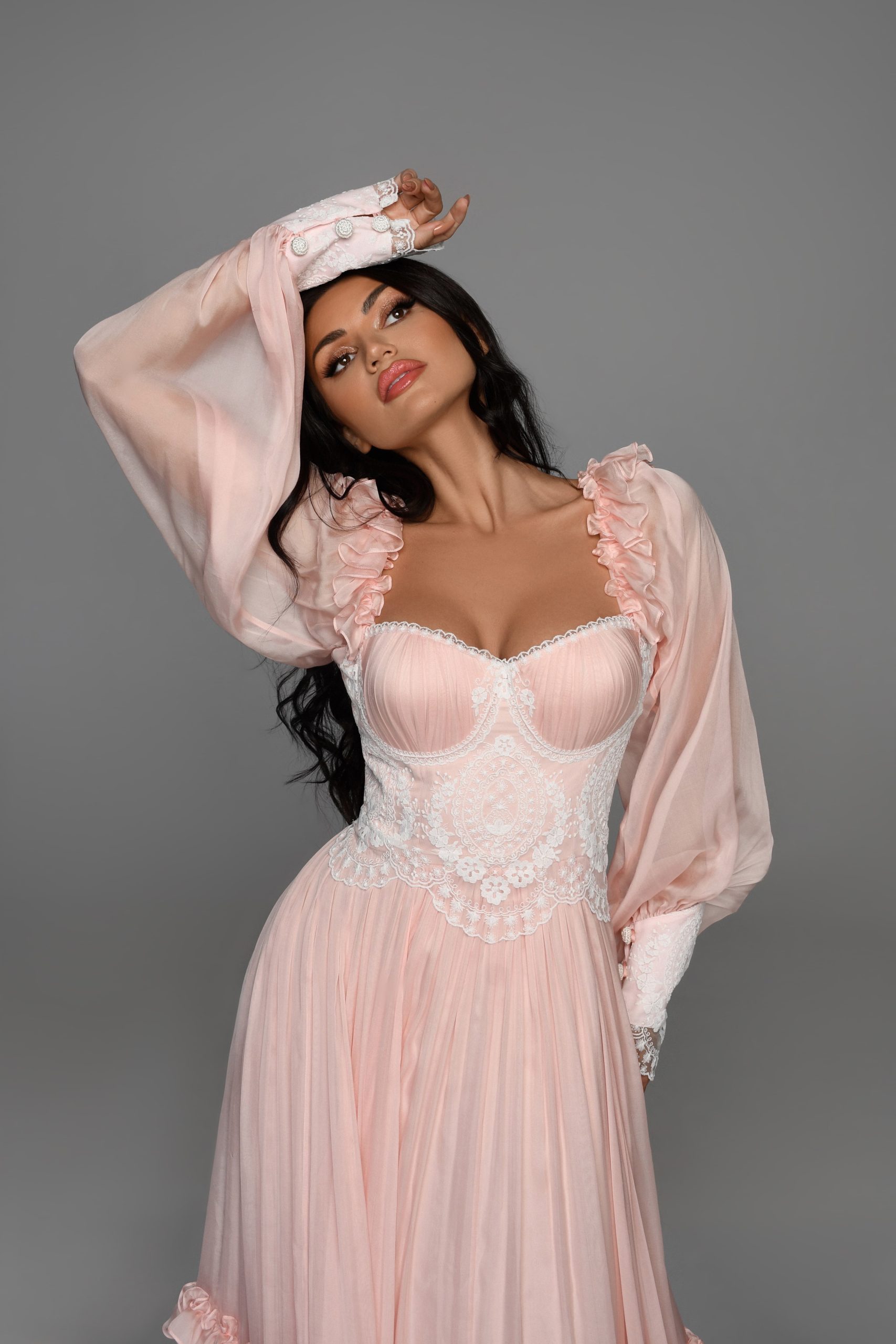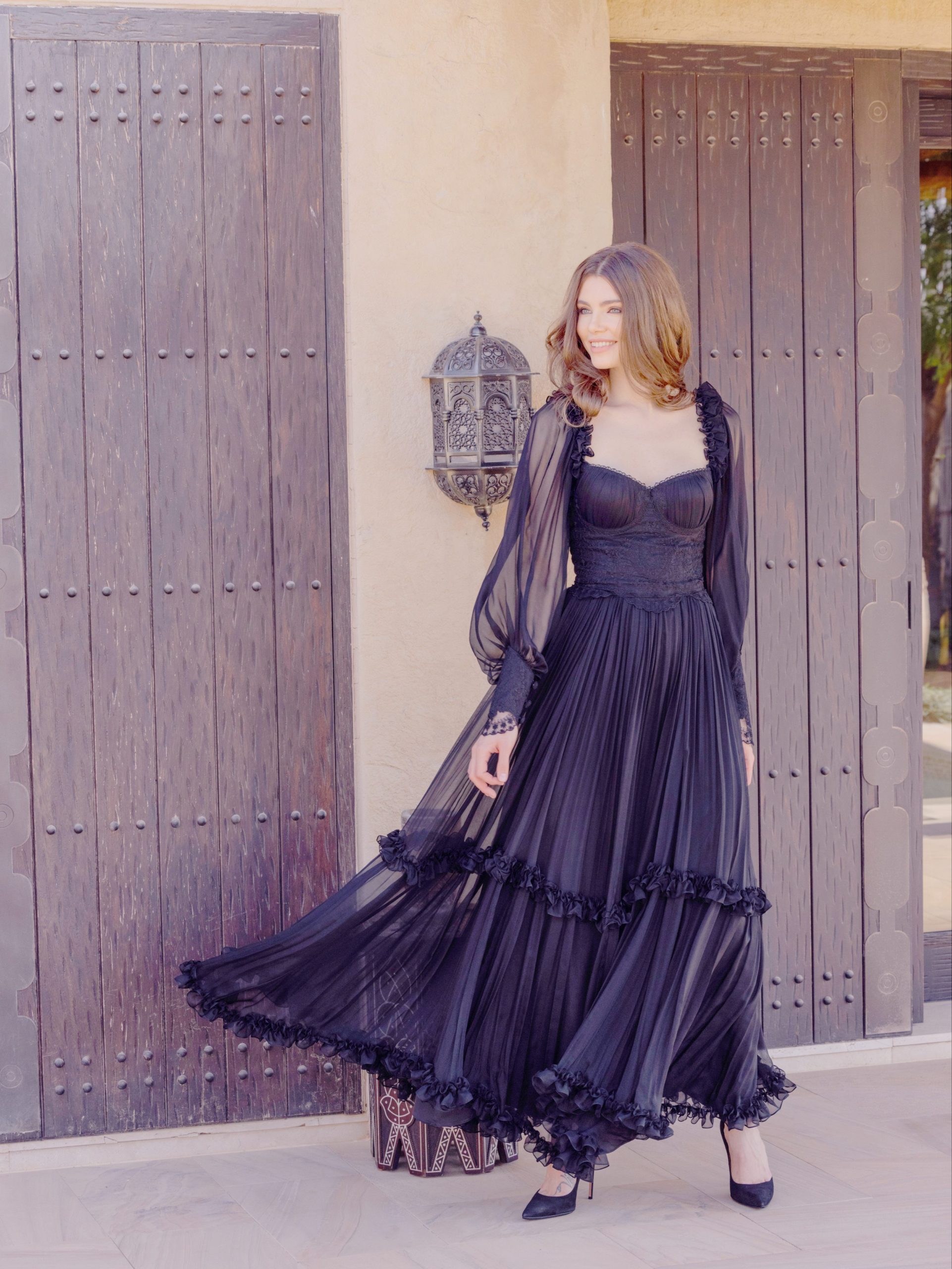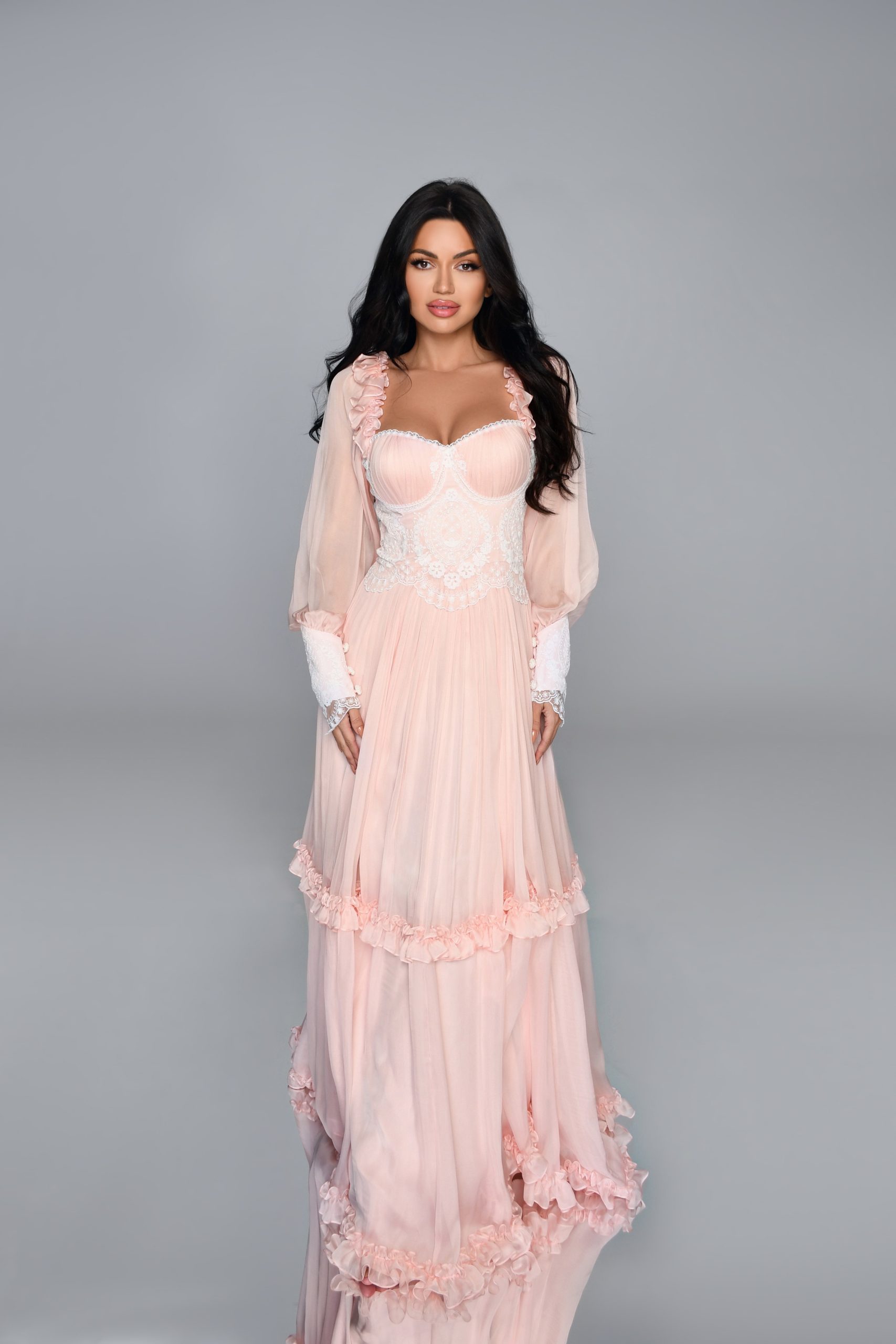 This divine long dress is made of the finest silk chiffon, intricate Swiss lace, and puts on quite a show when you think frills and frou-frou. From the sleeves to the rim, Dream is like Queen of the night.