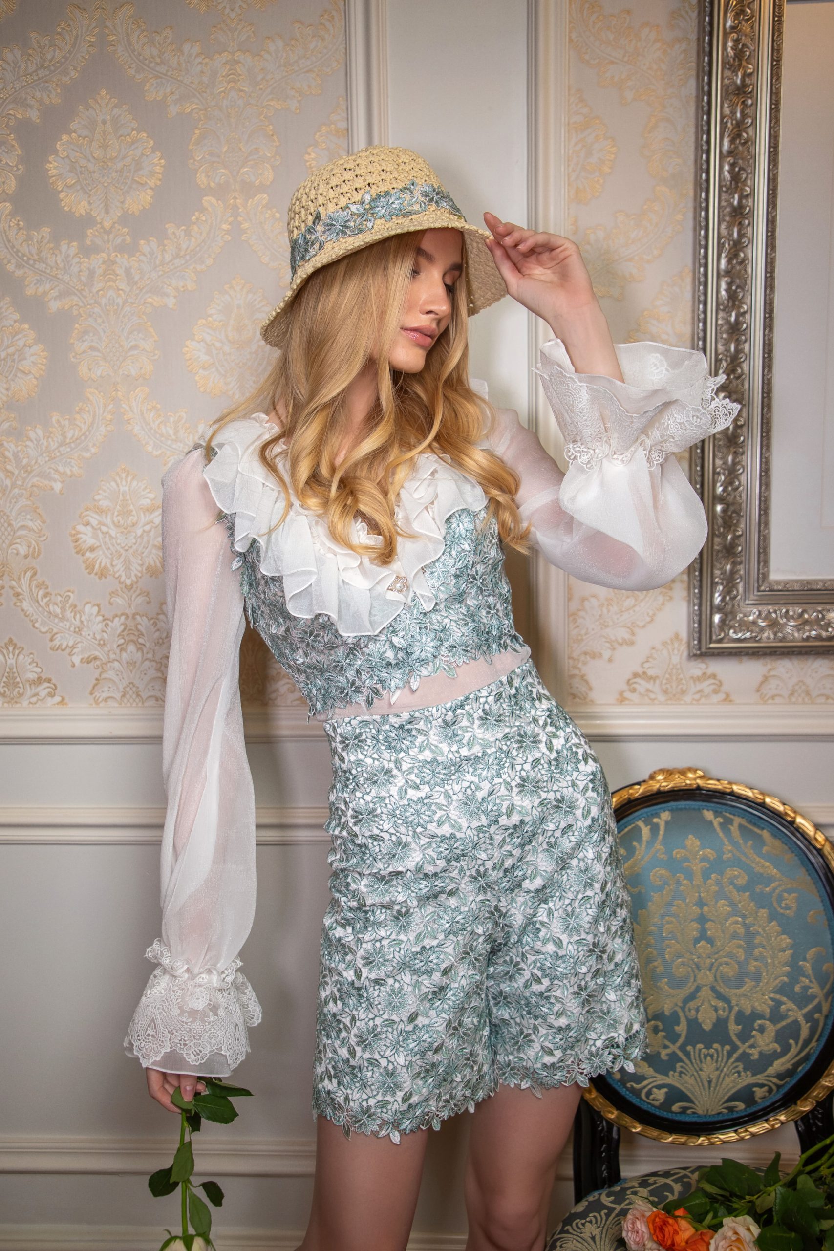 A romantic three-piece set composed of a sheer white blouse with flounced lace cuffs, a floral lace vest, and matching high-waisted shorts. Eden Bloom blends vintage poetry with modern tailoring, designed for graceful days and garden dreams.