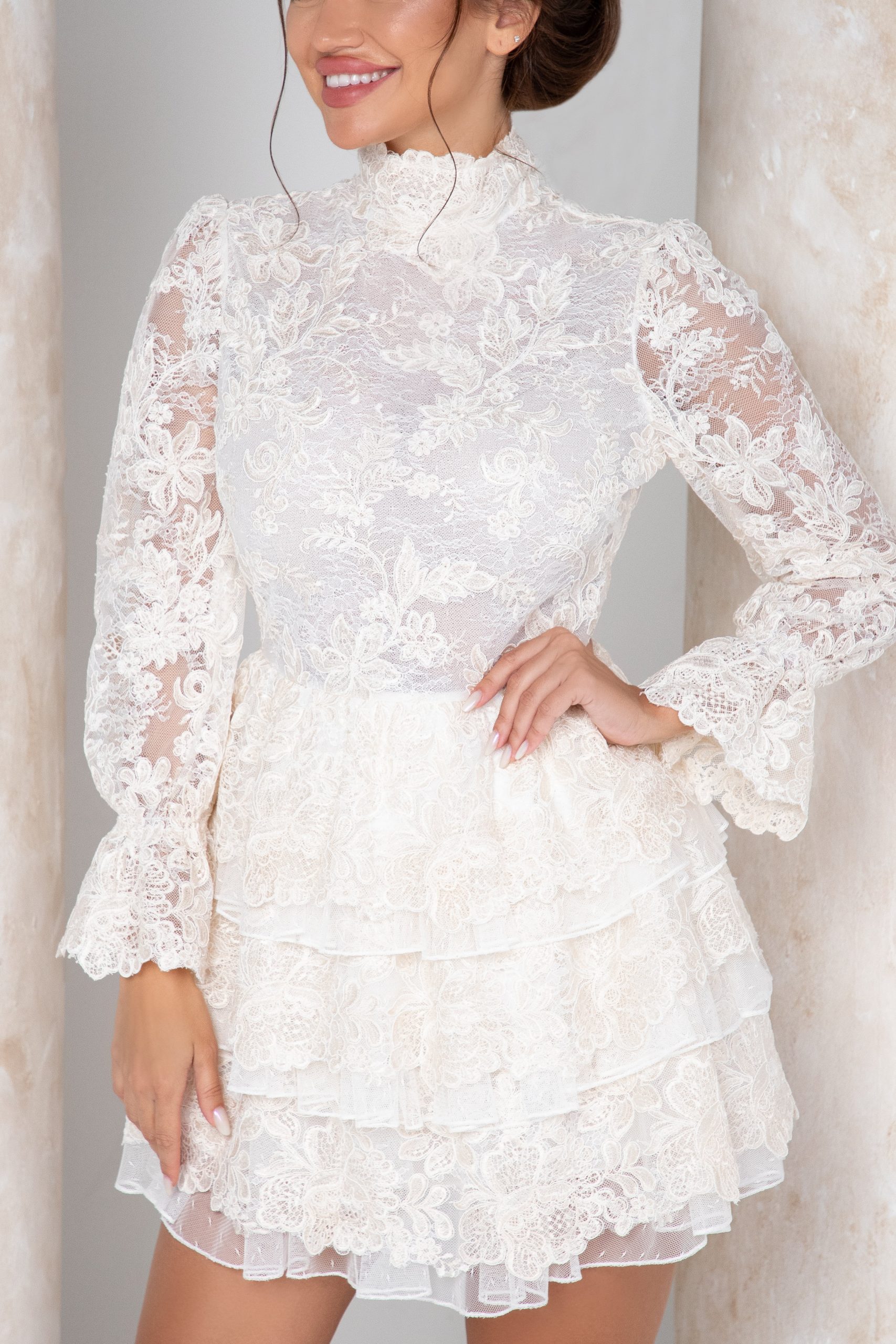Introducing our exquisite short layers dress, a masterpiece of timeless elegance and luxurious craftsmanship. This dress features long sleeves and is adorned with intricate handmade embroidery on the finest French lace. The cream white color palette enhances its sophisticated appeal, making it the perfect choice for any special occasion. Every detail of this dress is designed to exude opulence, from the delicate layers that create a graceful silhouette to the meticulous embroidery that adds a touch of artisanal charm. Embrace a look of refined luxury with this stunning piece, crafted to make you feel truly extraordinary.