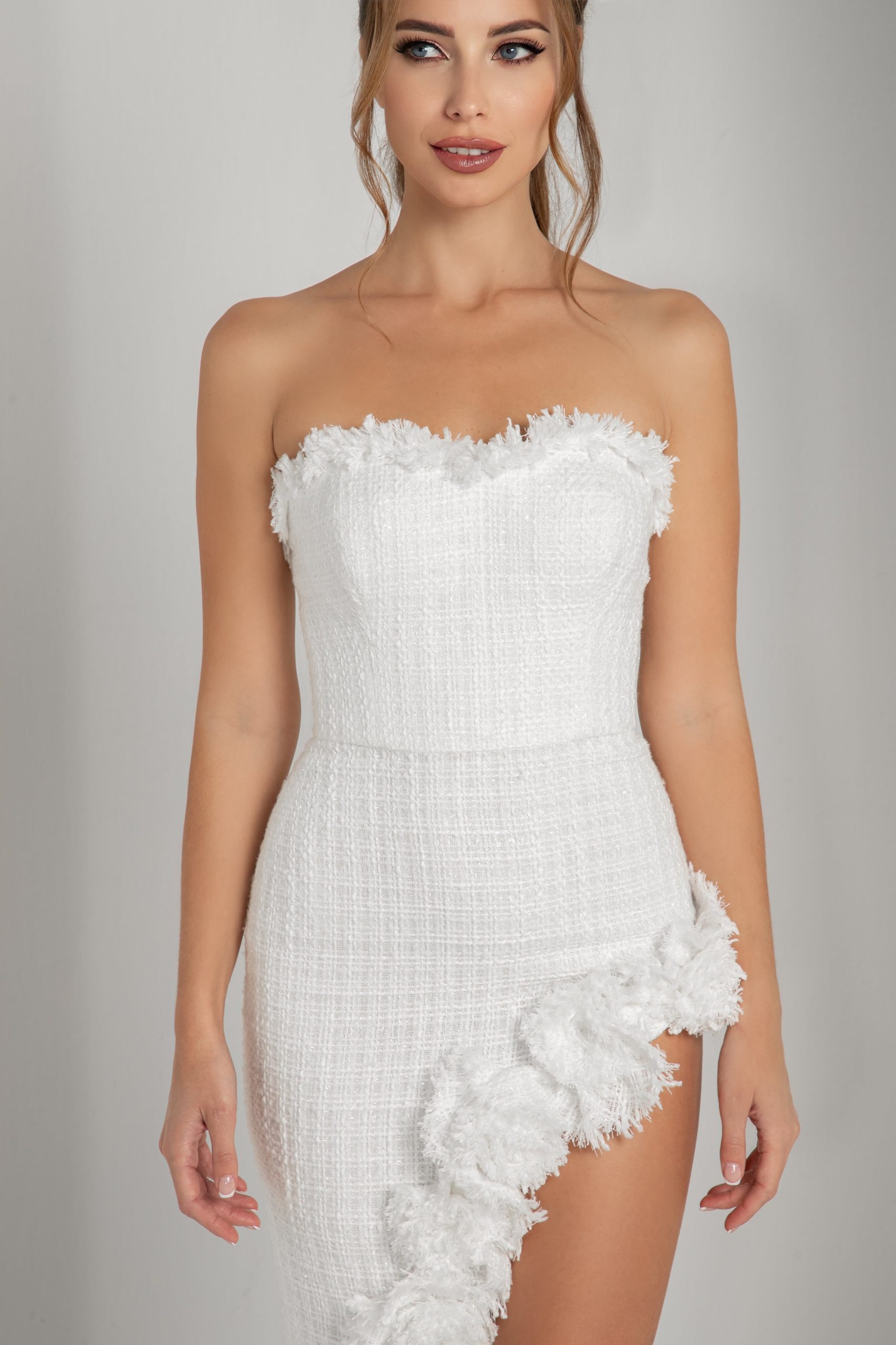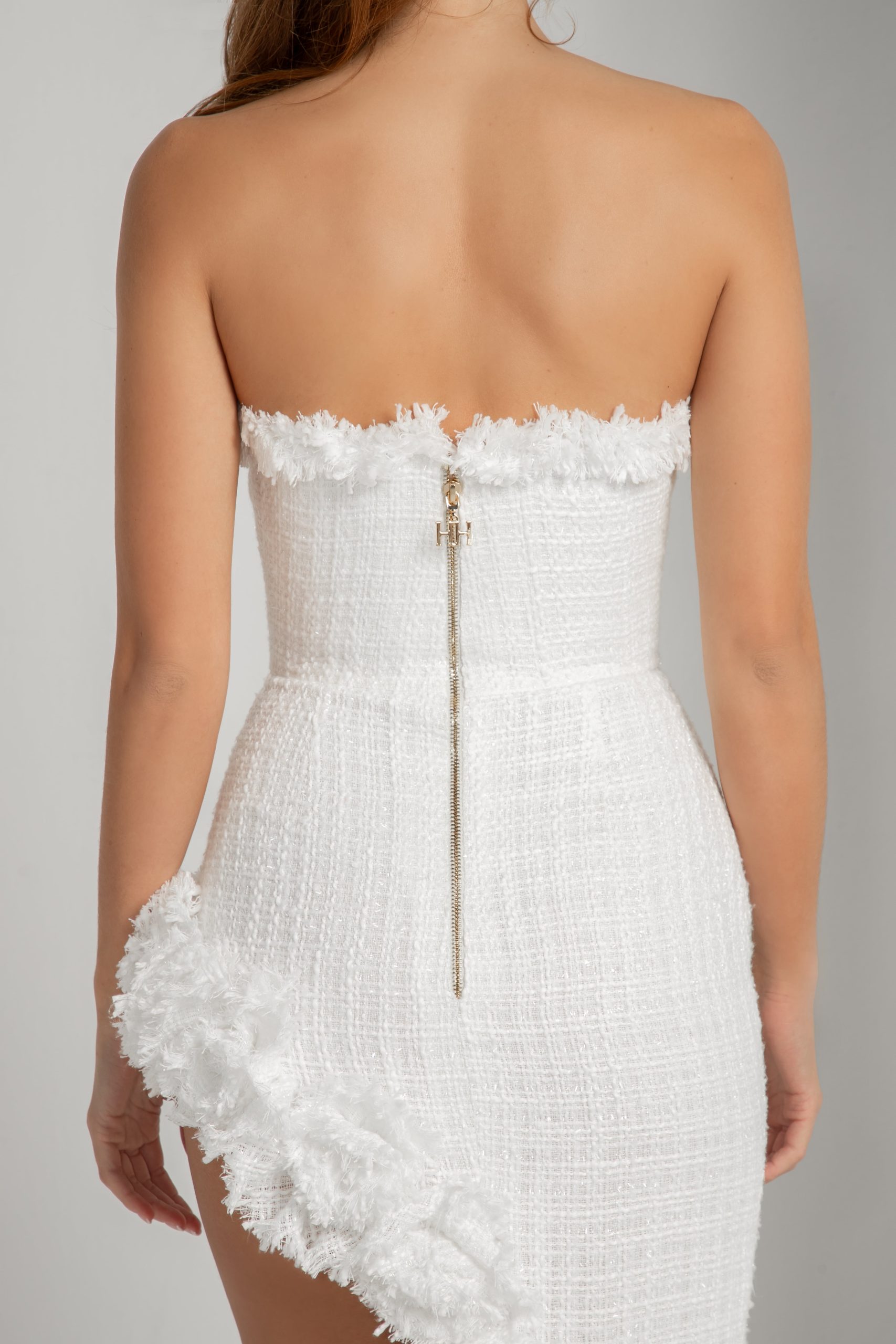 A vision of grace and modernity, this white tweed dress embodies the essence of femininity. The soft, textured tweed is tailored to perfection, flowing into an asymmetric skirt that adds movement and intrigue to the design. The subtle play of angles flatters the silhouette, celebrating the strength and elegance of a woman. With its timeless appeal and contemporary edge, this dress is a tribute to the art of femininity, capturing beauty in every detail.
