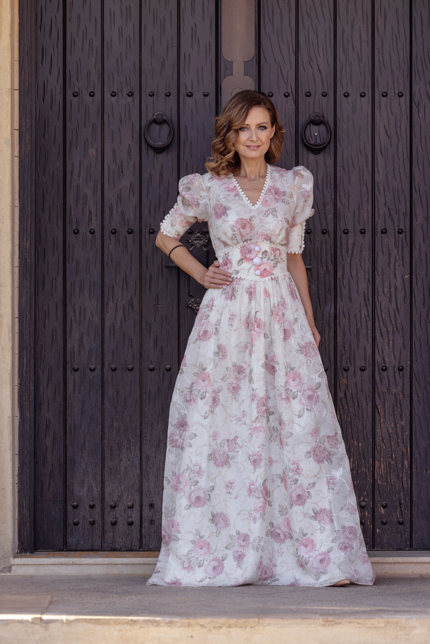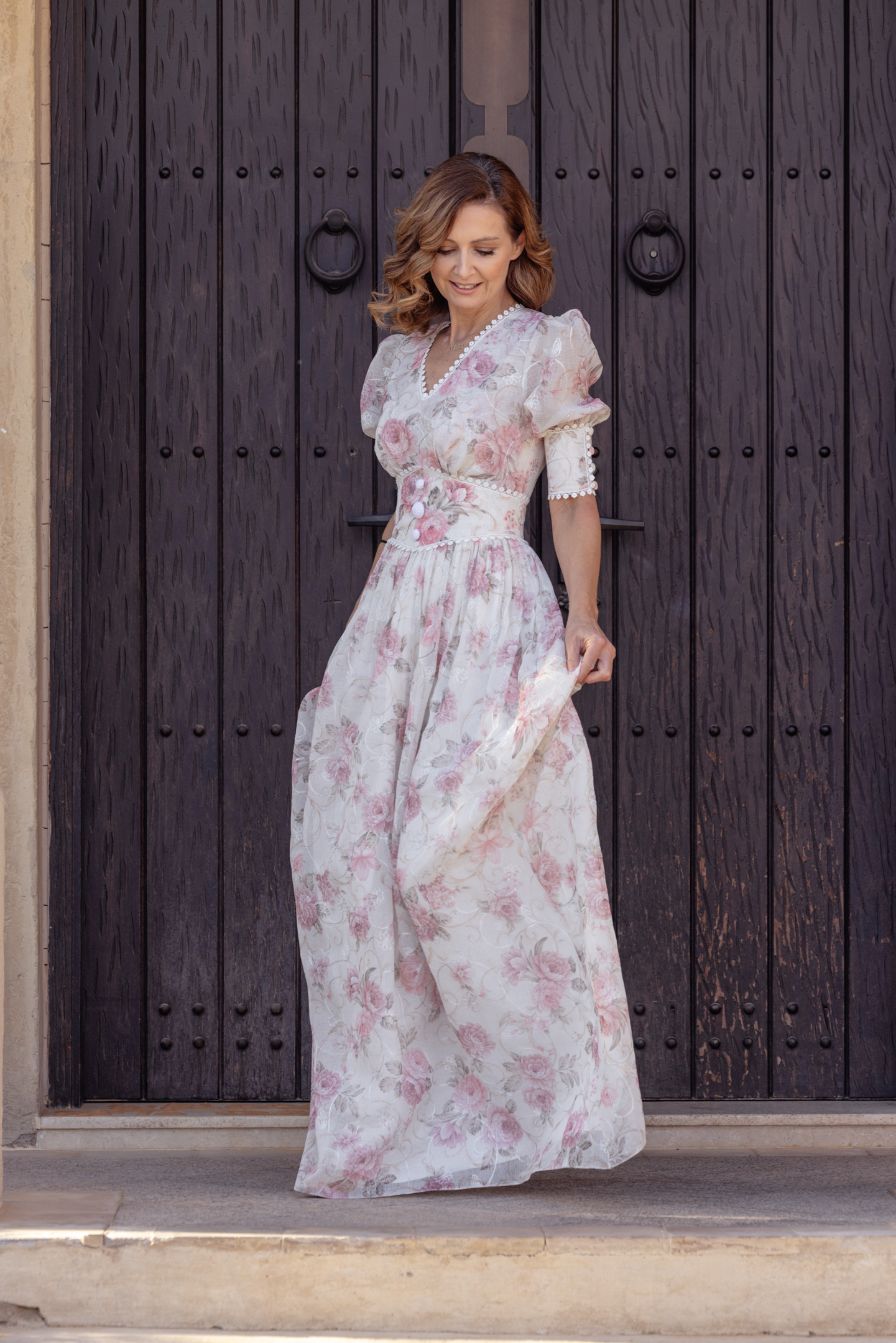 Fabric: Dress in printed linen and cotton, premium laces, handmade crochet buttons