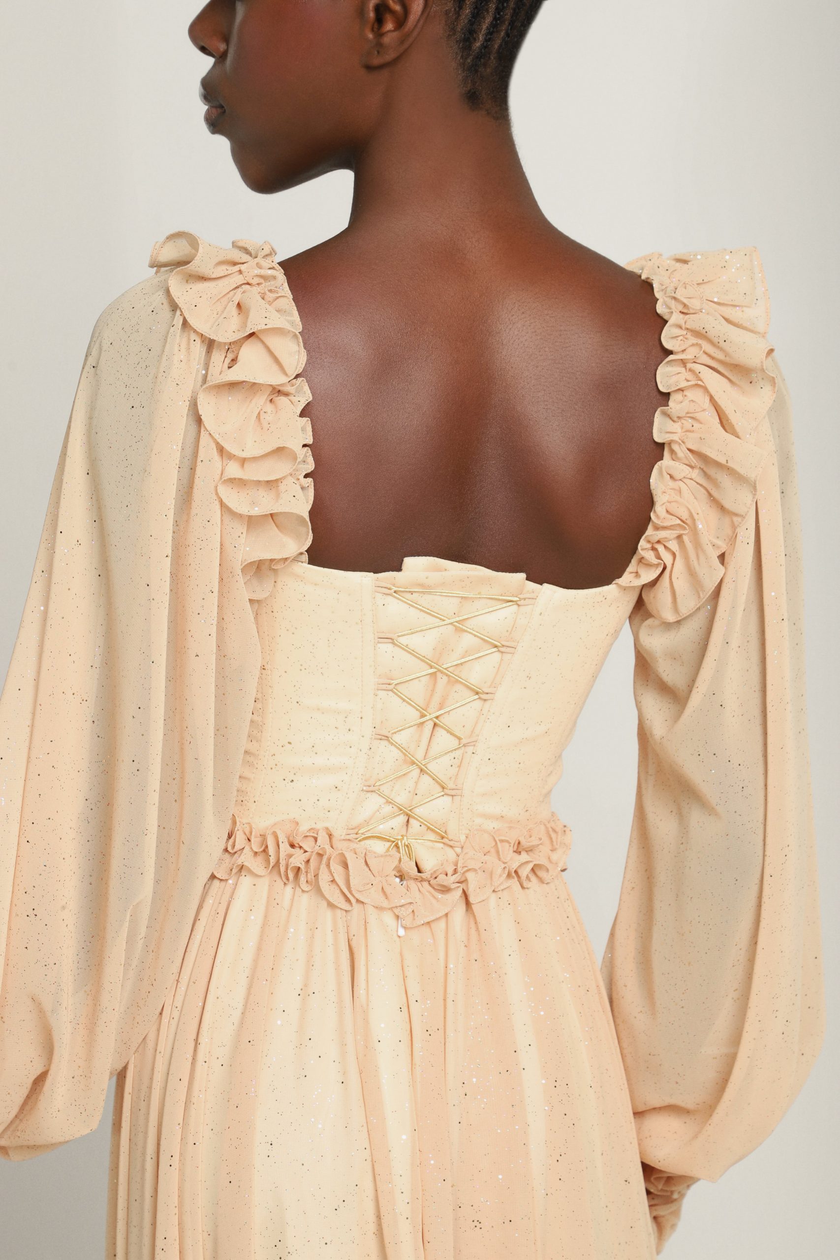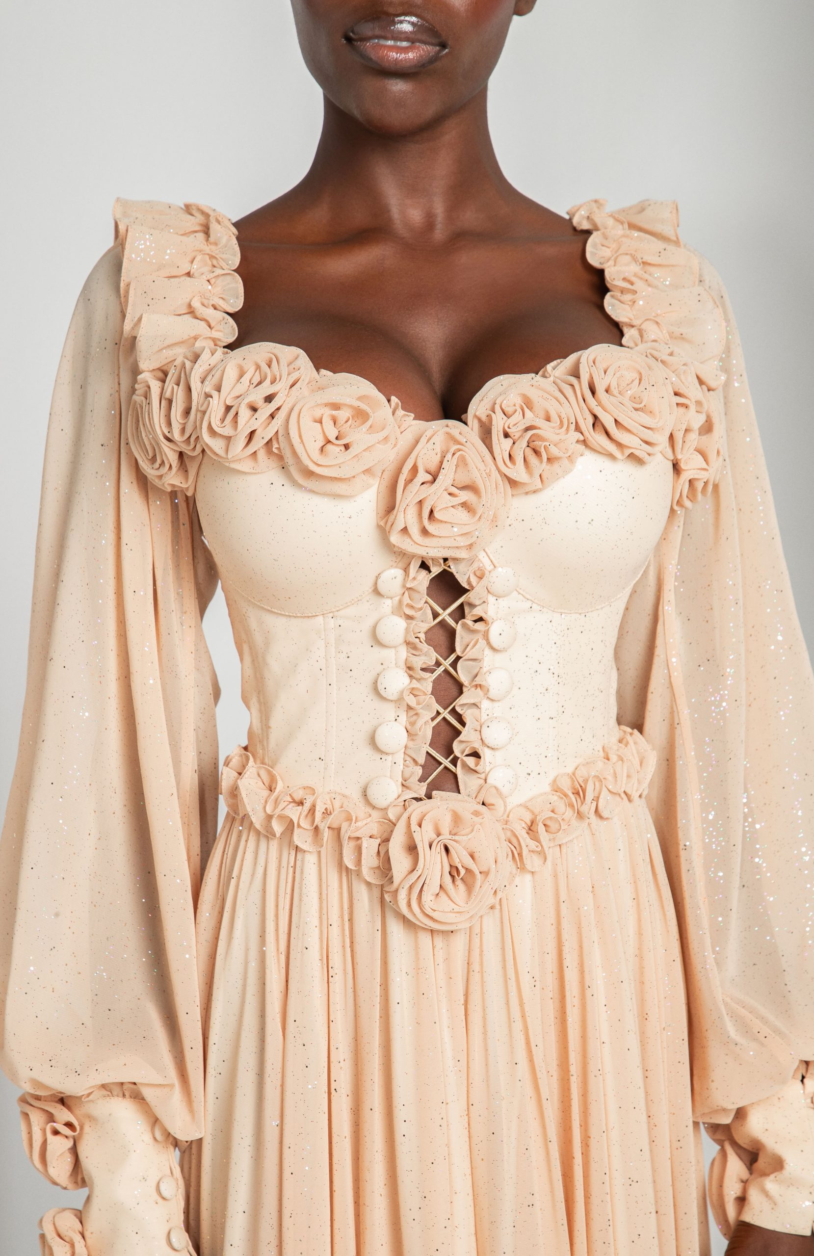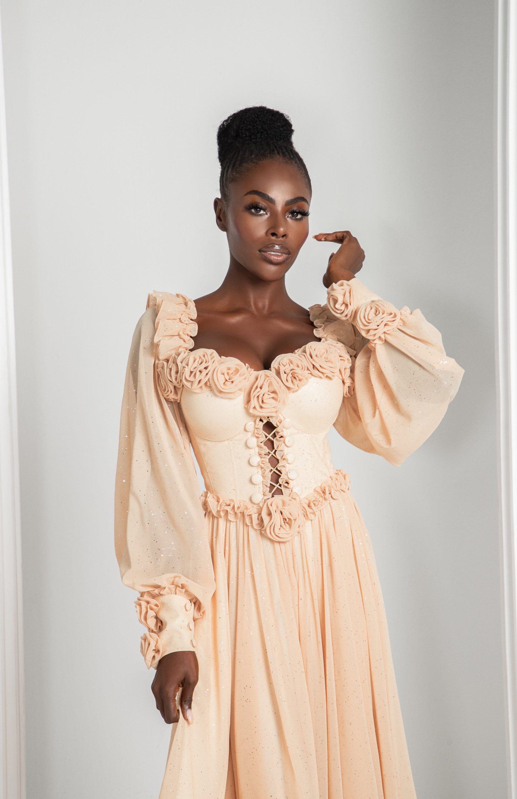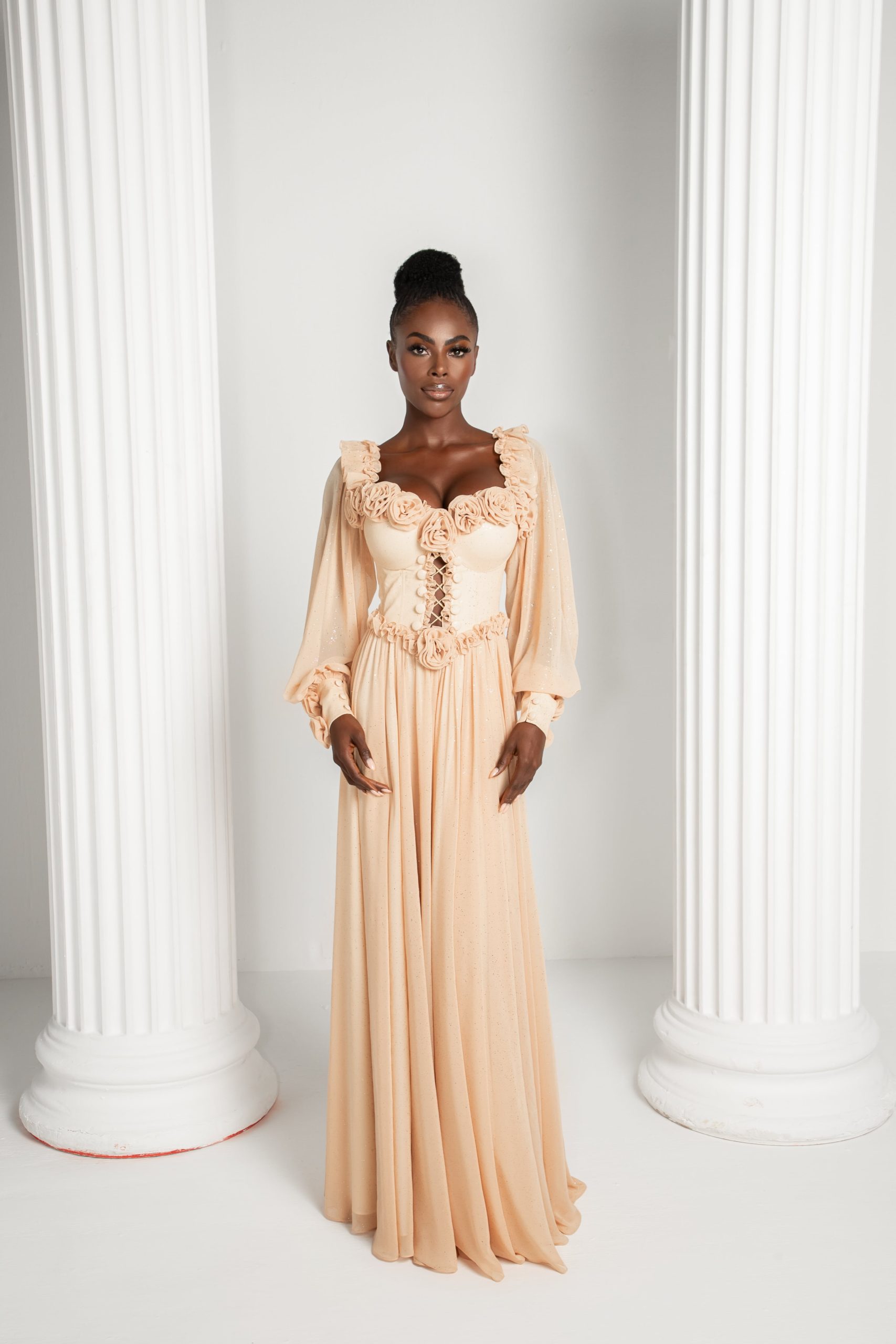 Introducing the Gitana dress in a captivating shade of gold—a breathtaking creation that radiates luxury and fantasy. This signature HHart piece features a delicately structured corset with sculpted cups, each adorned with handmade roses that bring an elegant, romantic touch to the bodice. The voluminous sleeves are pure magic, designed for a fairytale princess with their ethereal flow and intricate craftsmanship. Made for those who dream big, this dress envelops you in golden enchantment, blending timeless sophistication with an unmistakable charm. A masterpiece fit for royalty, designed to make every moment unforgettable.