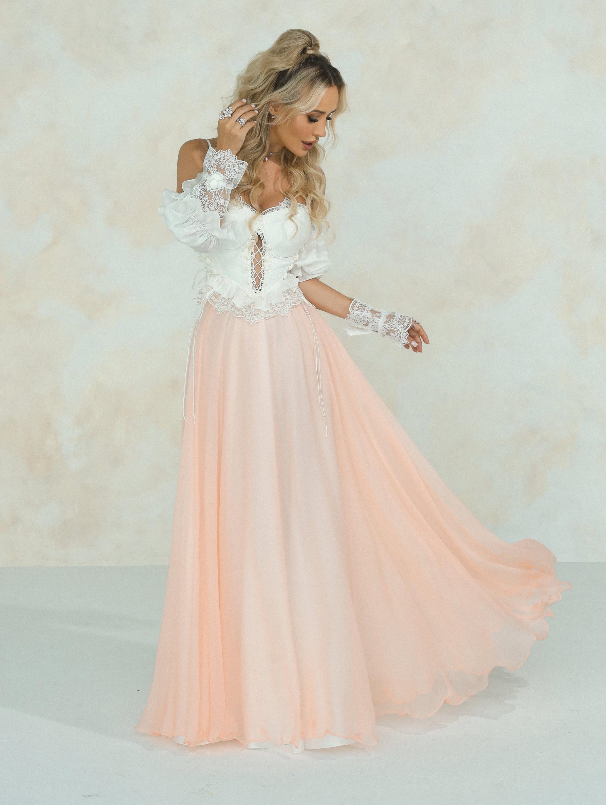 Fabric: Dress in silk chiffon, cotton silk and French laces