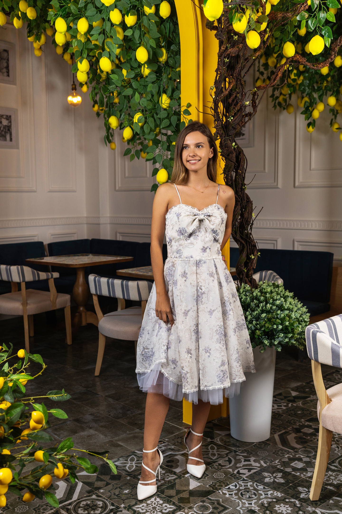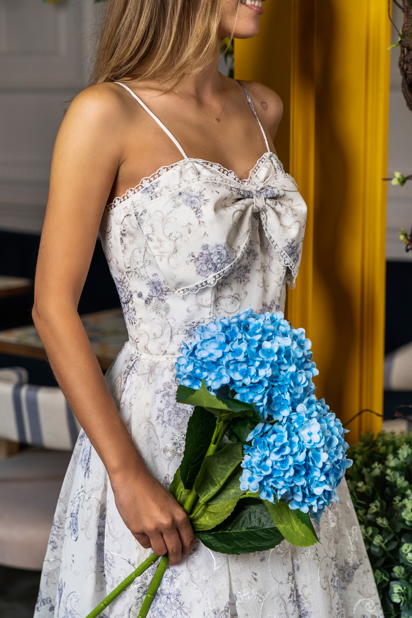 Joy, purity, youthful, a quirky cotton and linen number, with thin straps to frame the neckline, Julia also comes in a blue bijou flower pattern. Embroidered from the bow to the skirt, the playful dress dances in a tutu of the finest tulle.
