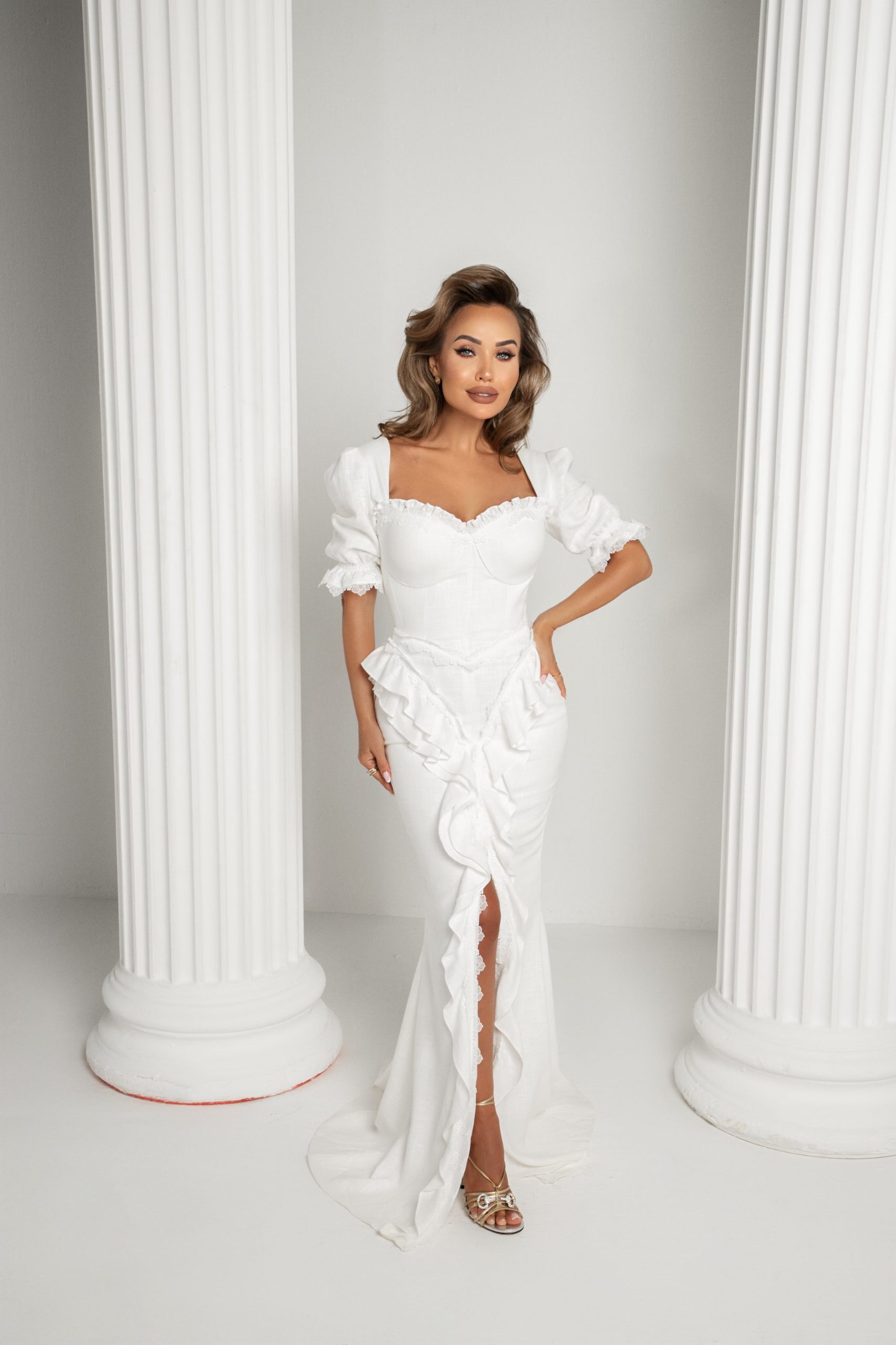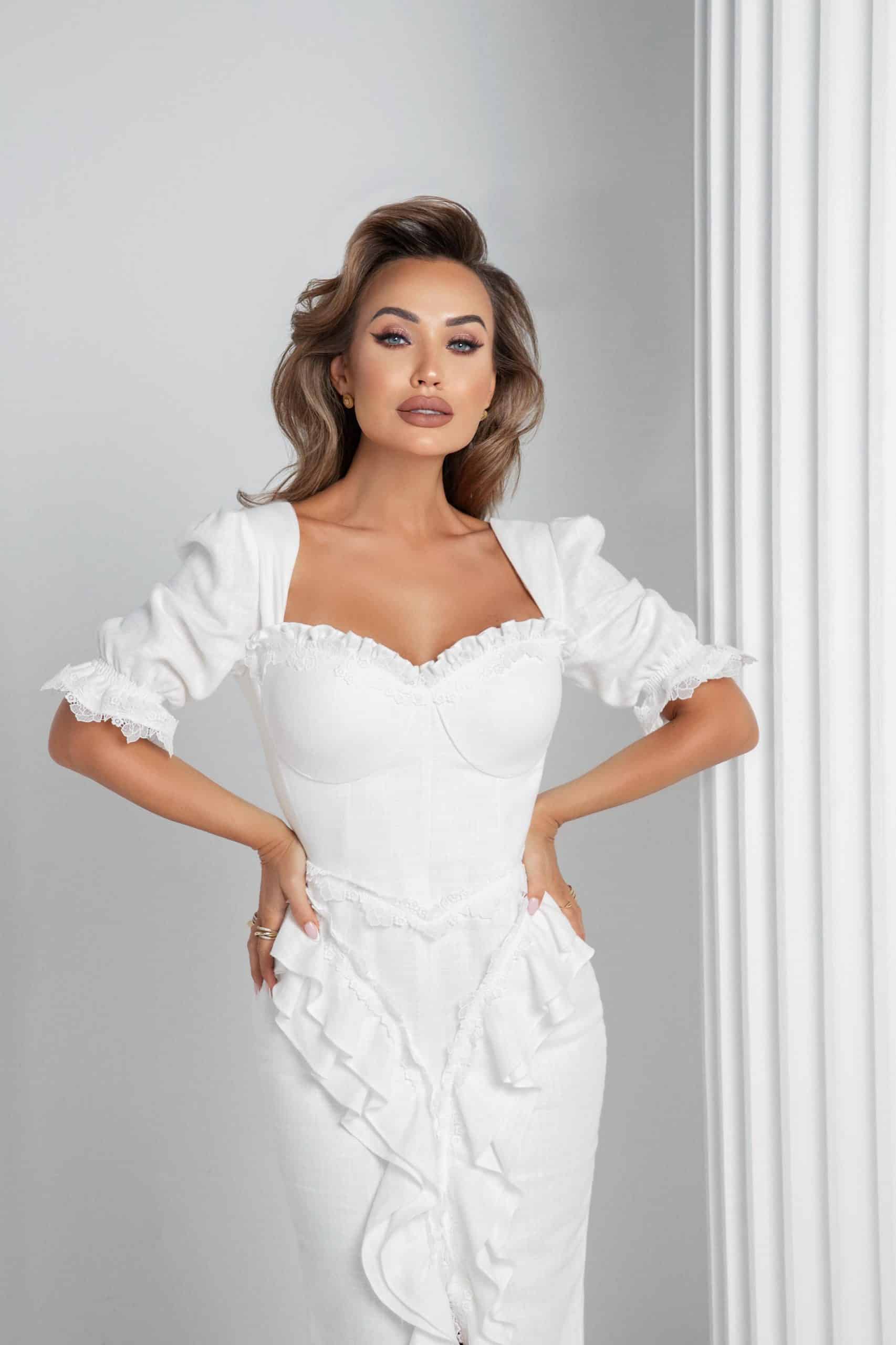 A majestic dress made from luxurious cotton linen, featuring a beautifully structured con skirt with soft, delicate ruffles down the center, adding texture and movement. The bodice is adorned with ruffles over the cups, exuding femininity and grace. Delicate French lace embellishments further enhance the dress, infusing it with romantic elegance. This piece perfectly balances sophistication and timeless beauty, designed for those who wish to make a lasting impression.