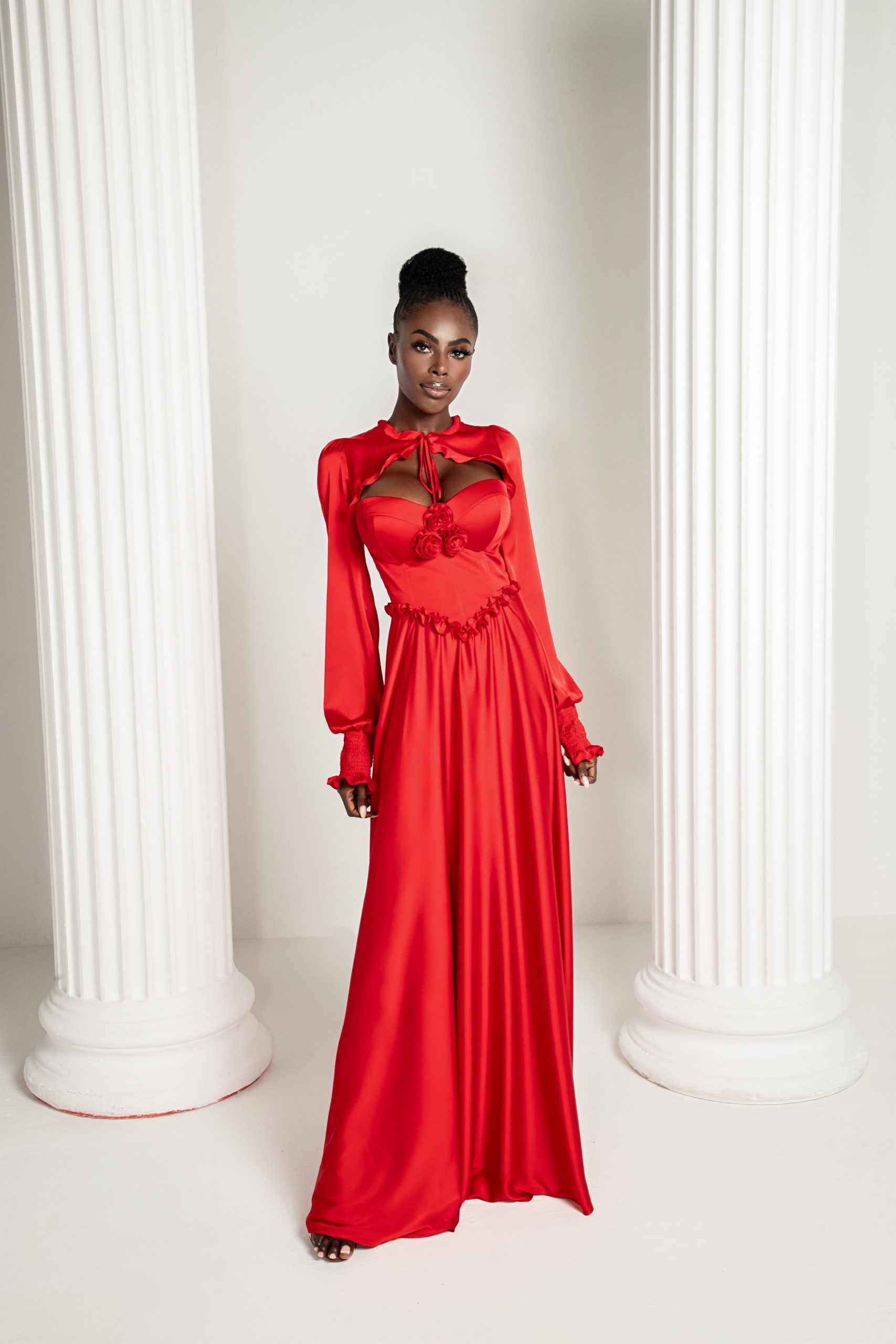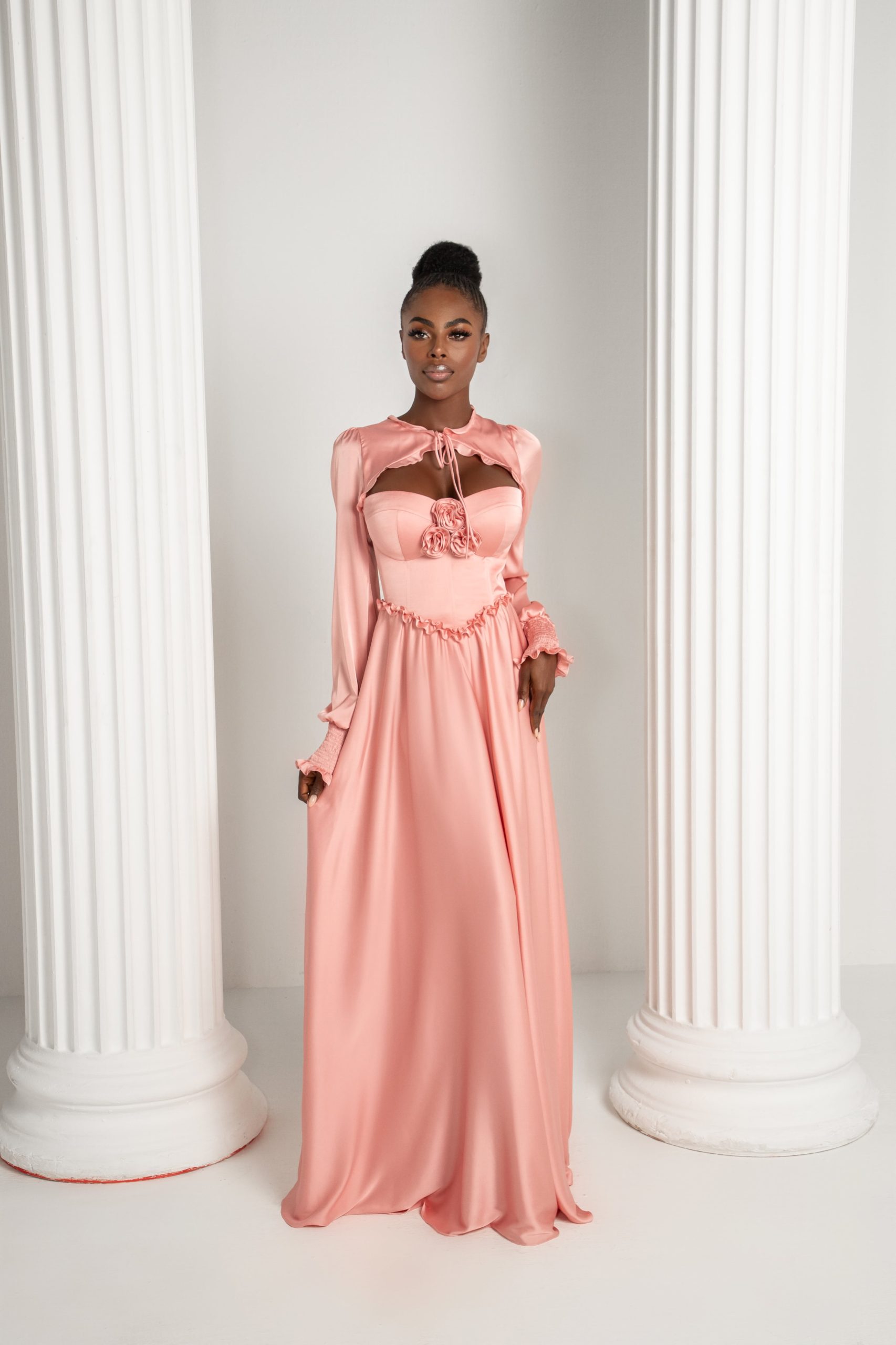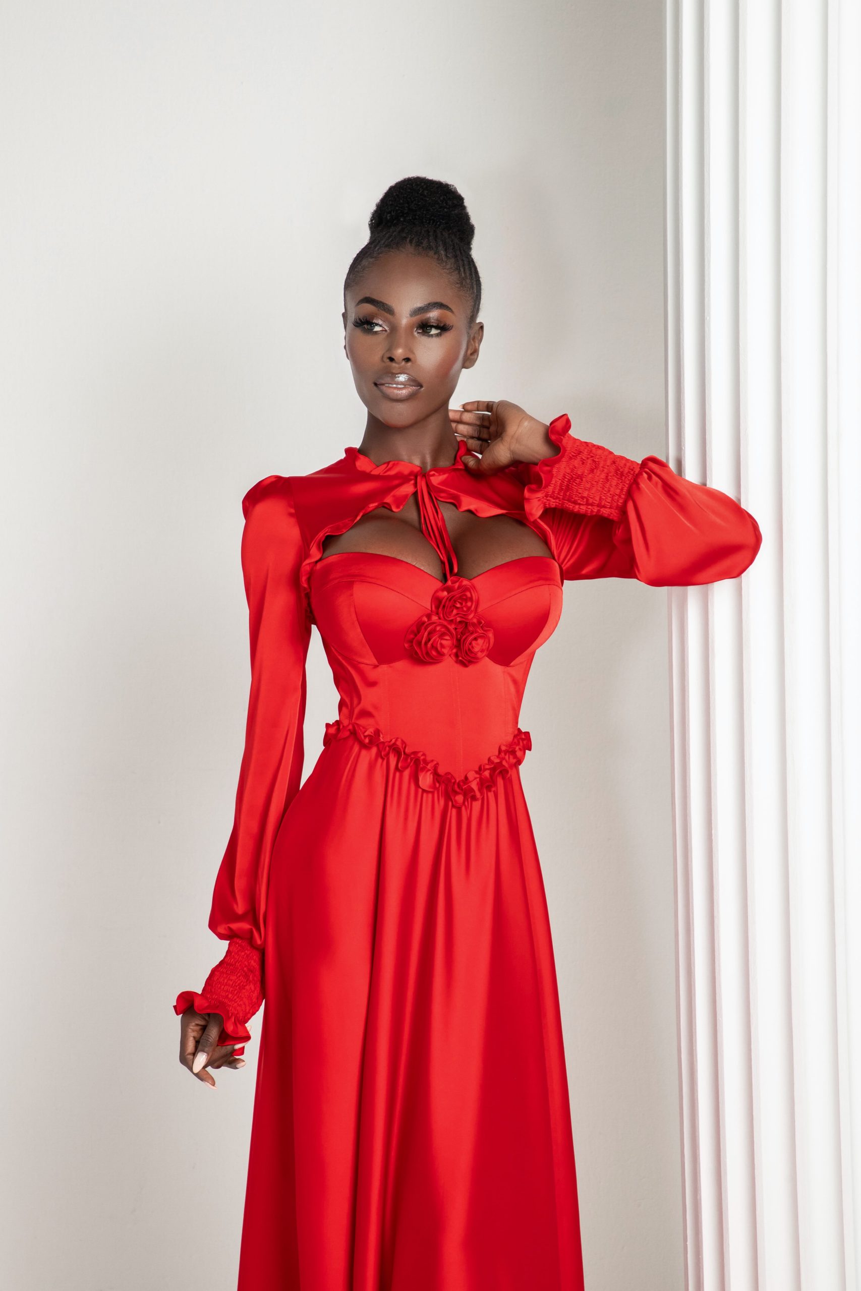Presenting our silk satin masterpiece—a dress that exudes elegance and royalty in every detail. The bodice is gracefully structured with refined cups, each adorned with handmade roses, creating a delicate floral charm that highlights femininity. Flowing from the fitted waist, a single cloche skirt drapes beautifully, offering an understated yet regal silhouette. Small, subtle ruffles at the waist add a hint of texture, enhancing the dress’s romantic appeal. With its luxurious silk satin finish, this gown is a true statement piece, embodying timeless sophistication and royal grace.