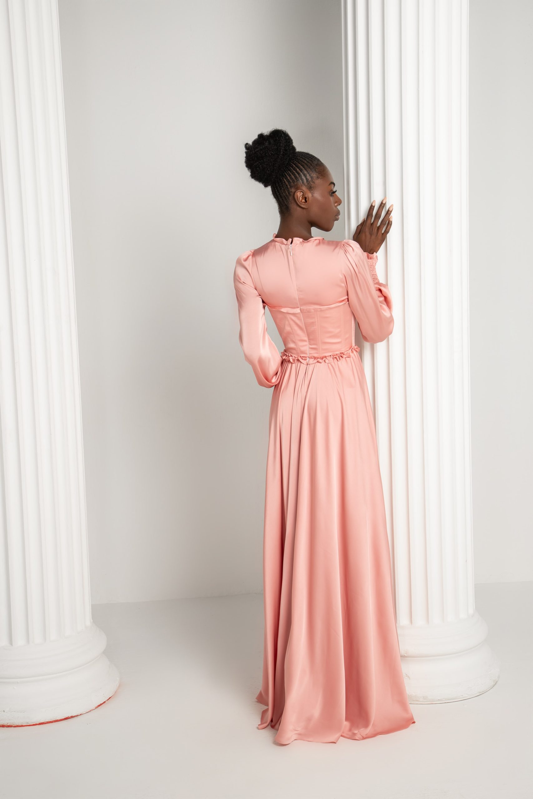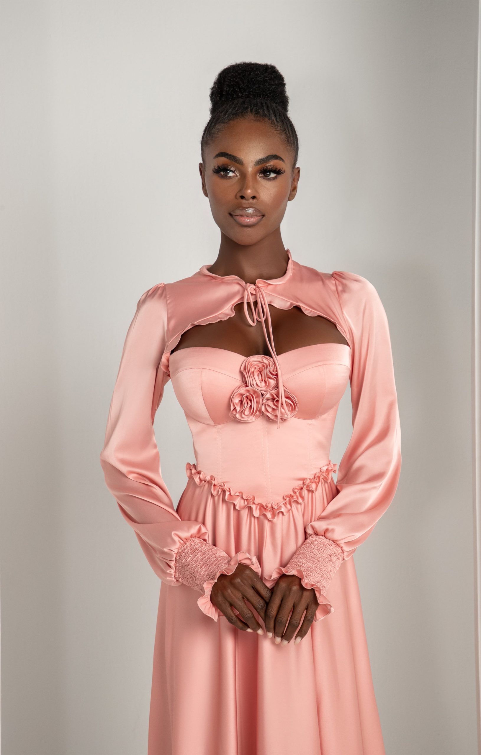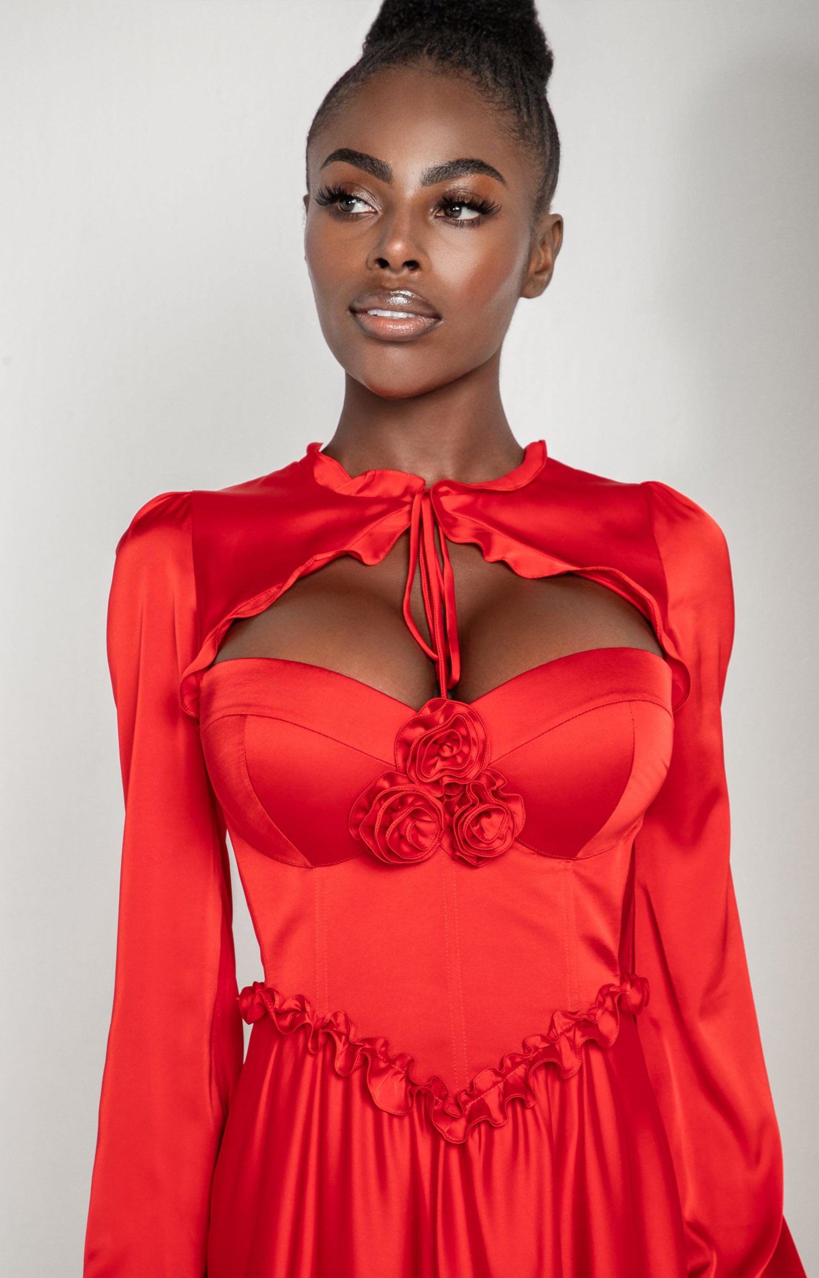 Presenting our silk satin masterpiece—a dress that exudes elegance and royalty in every detail. The bodice is gracefully structured with refined cups, each adorned with handmade roses, creating a delicate floral charm that highlights femininity. Flowing from the fitted waist, a single cloche skirt drapes beautifully, offering an understated yet regal silhouette. Small, subtle ruffles at the waist add a hint of texture, enhancing the dress’s romantic appeal. With its luxurious silk satin finish, this gown is a true statement piece, embodying timeless sophistication and royal grace.