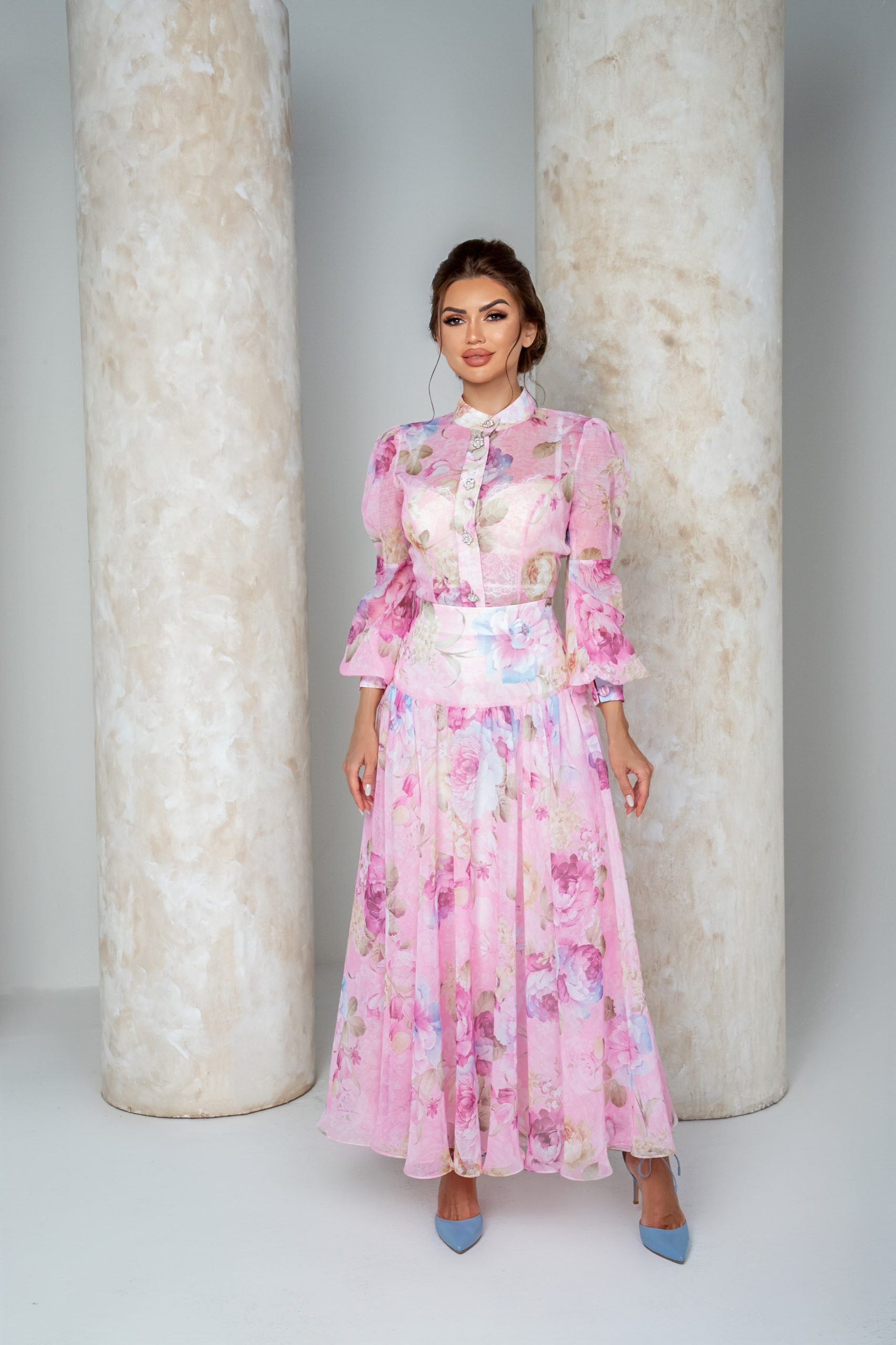A soft floral linen organza set features a classic top with long sleeves, adorned with pearl crystal buttons in a flower shape. The fabric has a delicate pastel floral pattern, adding vintage charm. The top has a modest neckline and long, elegant sleeves, while the skirt is a single cloche design that creates a graceful A-line silhouette. The skirt drapes beautifully and falls to the ankles, providing gentle and flowing movement. This set combines the softness of floral linen organza with luxurious detailing, resulting in a timeless and elegant look perfect for any sophisticated occasion.