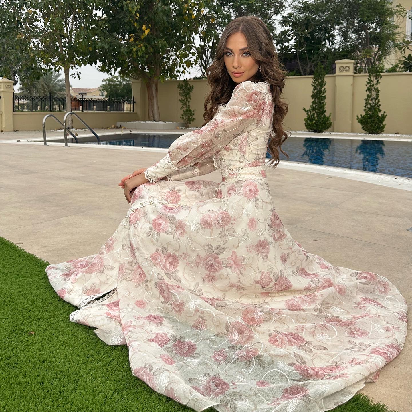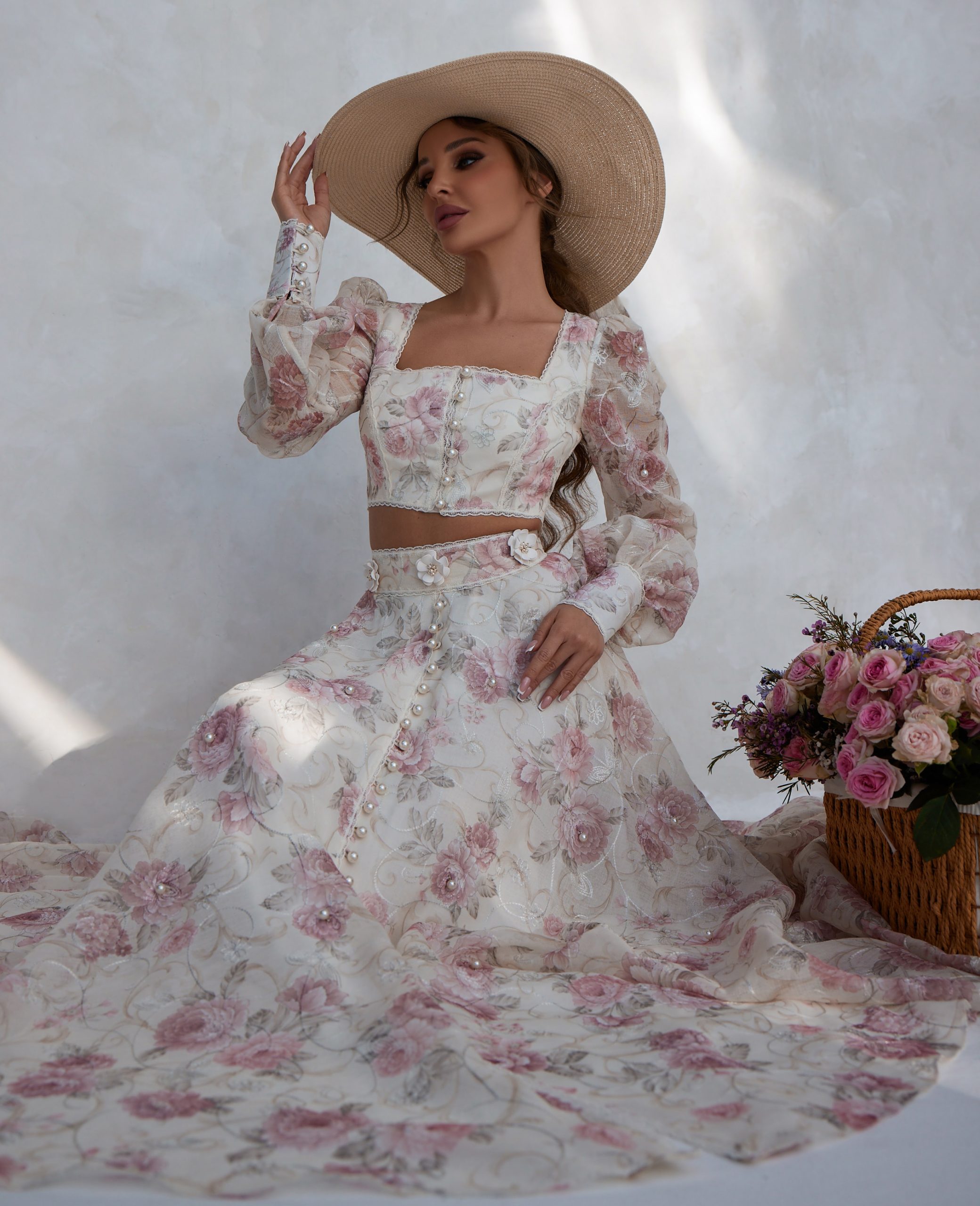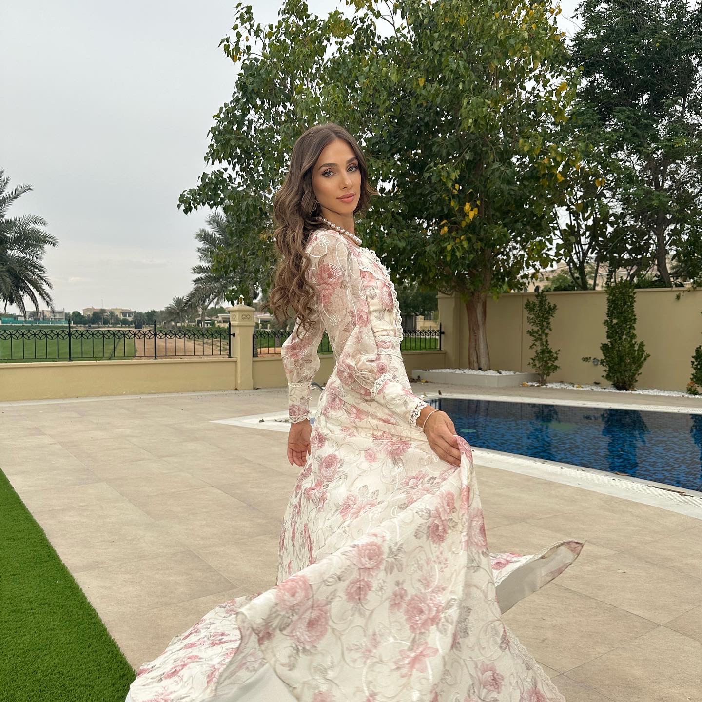 An extravagance of Swiss lace and pearls, flowing to perfection, to make your grand entrance at the most exquisite gatherings, Madame de La Fayette embraces the soul of HHart. Handmade in the UAE, with the finest linen, delicately embroidered, and beautiful pearls this dress is a cloud of elegance, floating through pinkish sunsets of flowers in bloom. This is me, dancing between the most beautiful flowers in Heaven Garden.