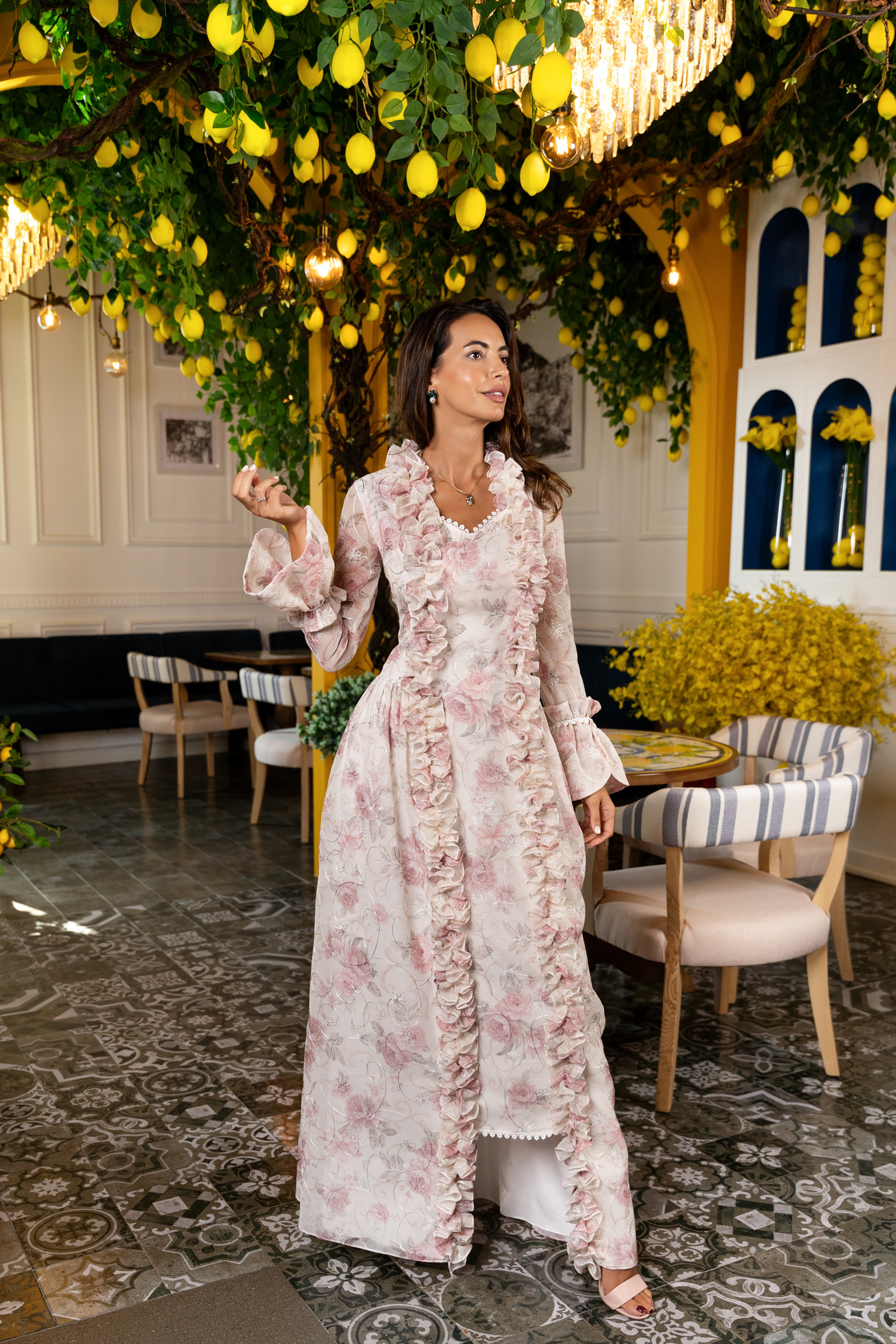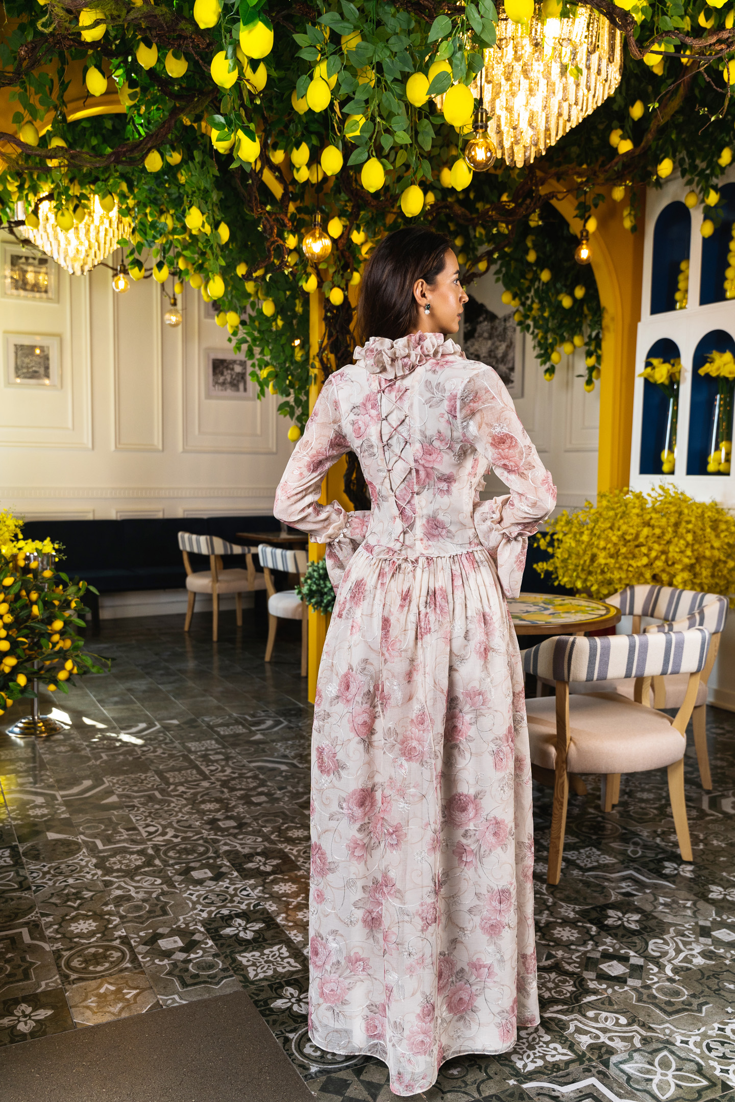 This long dress says royalty from the frou-frou neckline to the heels. More than a classic cut, here is a historical design, that takes us back to the court of Versailles, whilst playing with comfortable and light cotton-linen fabrics. The Swiss lacing and floral “toile de jouy” are perfectly on point for this extravagant number by HHart.