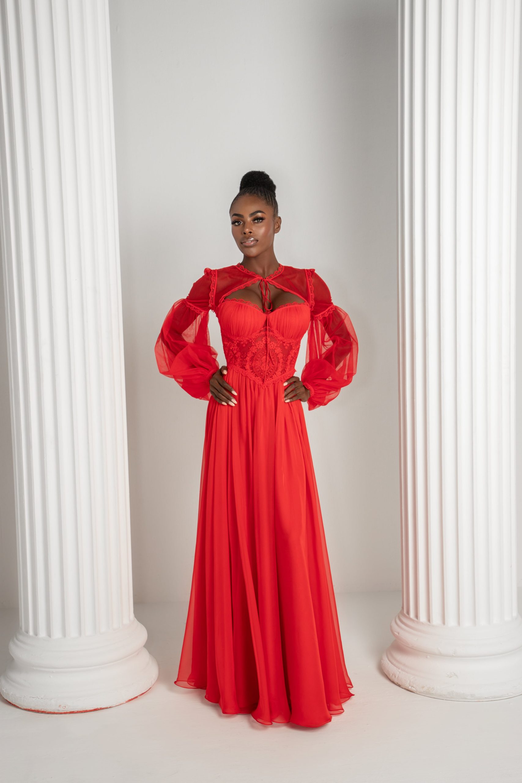 Step into a fairytale with our princess dress, a masterpiece woven from silk tulle, silk chiffon, and enchanting French laces. The corseted bodice, adorned with intricate lace, embraces timeless elegance, while the ethereal silk tulle sleeves add a whisper of magic. This dress is more than a design—it’s an invitation to a world of fantasy where beauty reigns supreme.