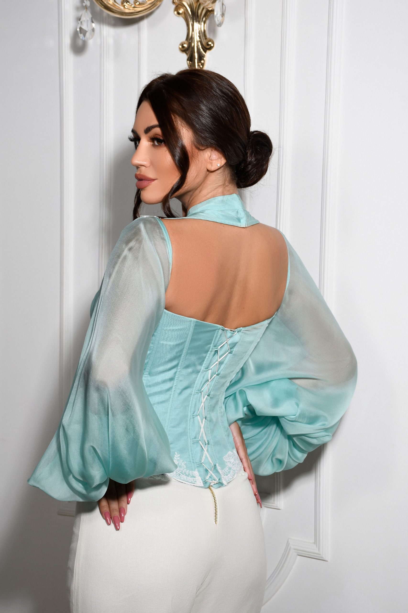 Unveiling one of HHart’s hallmark designs is this high-neck structured, stylish corset top that plays on transparency and celebrates modern femininity. Crafted in pure silk chiffon and Italian laces, it is distinguished by its contoured silhouette. True to the spirit of HHart, the top can be paired with the Falling in love cream Linen trousers for a fitted look.