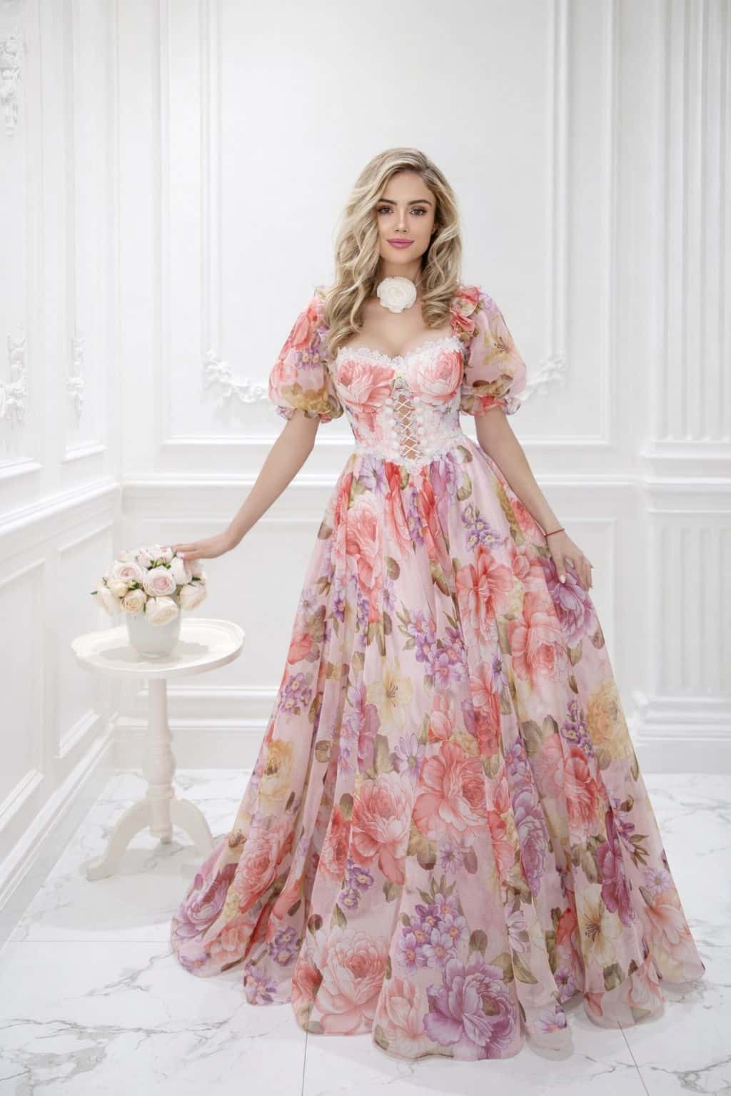 Petal Sonata is a blooming symphony of color and grace, featuring voluminous puff sleeves, a corset-style bodice laced with delicate floral appliqué, and a cascade of peony and garden blossoms across flowing chiffon. Hand-tailored at HHart Dubai, this couture creation celebrates the beauty of spring’s eternal romance, perfect for a woman who lives in poetry and flowers.