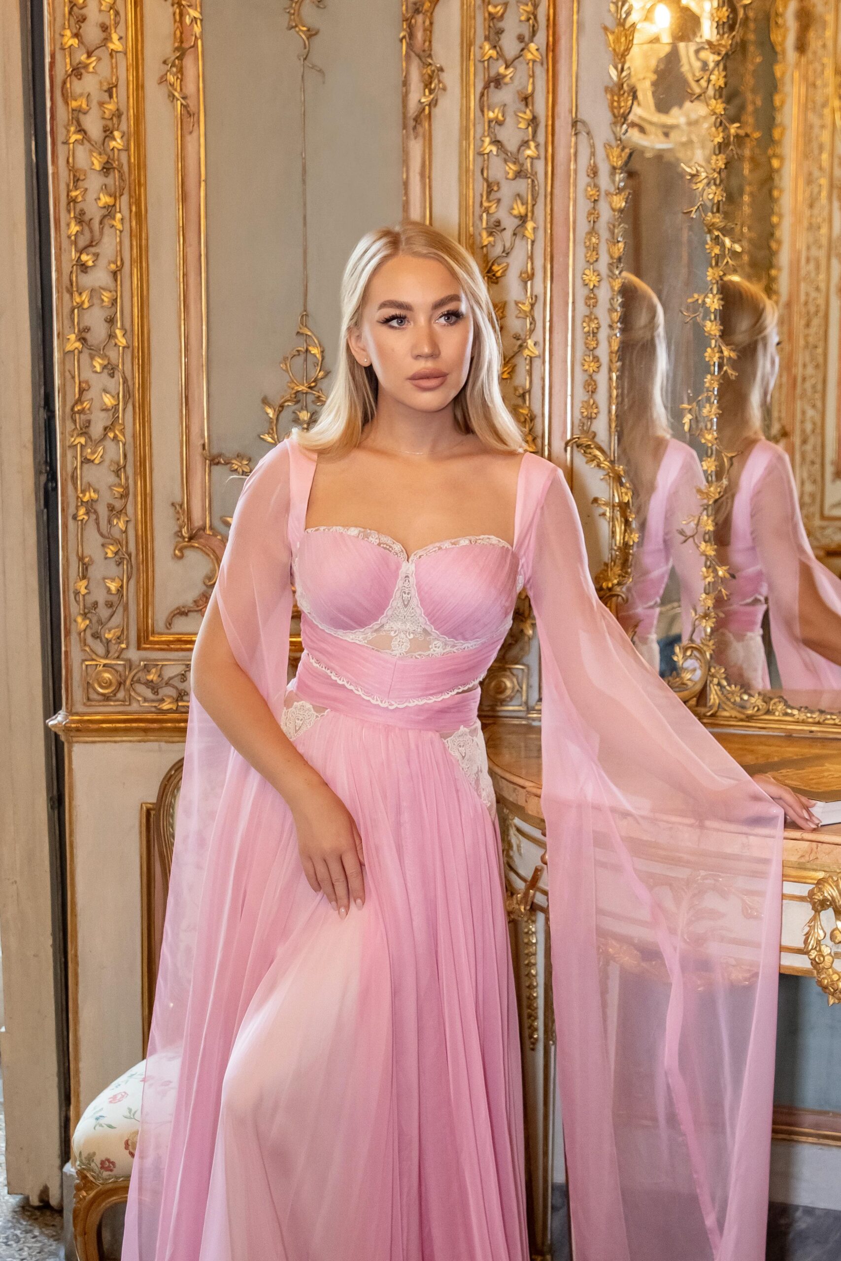 Step into a fairytale with the Rosa di Venezia gown — a masterpiece of grace and romance. Made from layers of soft pink chiffon, this off-shoulder design features a corset-style bodice with delicate lace accents, sculpting the silhouette with timeless elegance. Flowing drapes cascade from the arms, adding a regal touch to every movement. Designed for grand entrances and enchanted evenings.