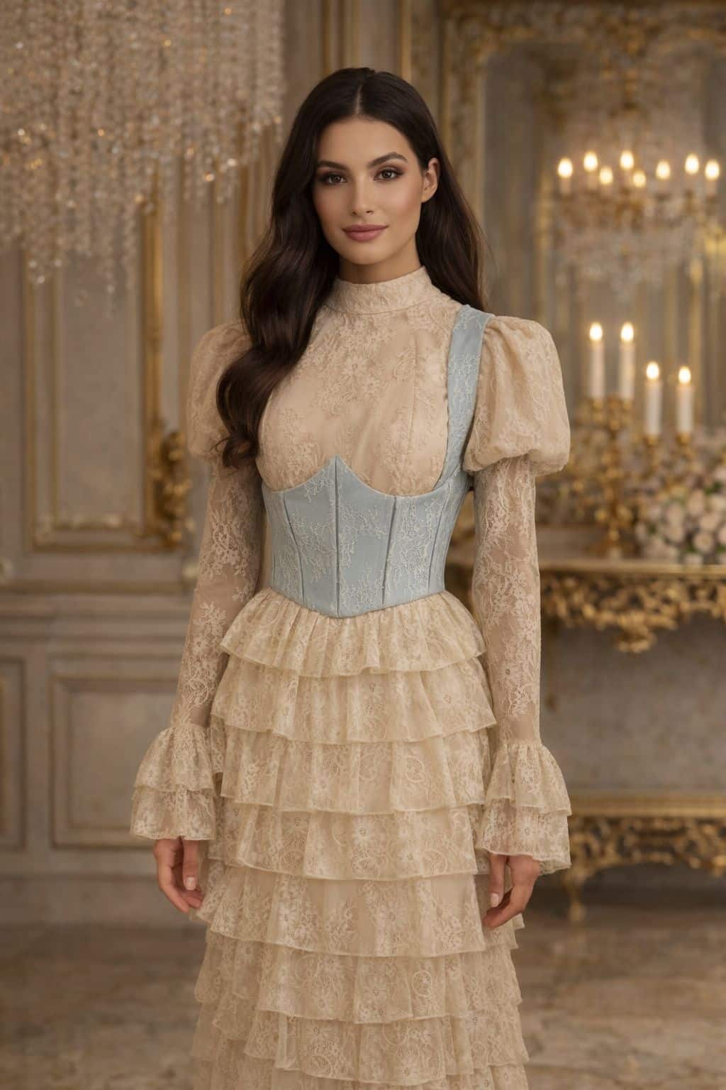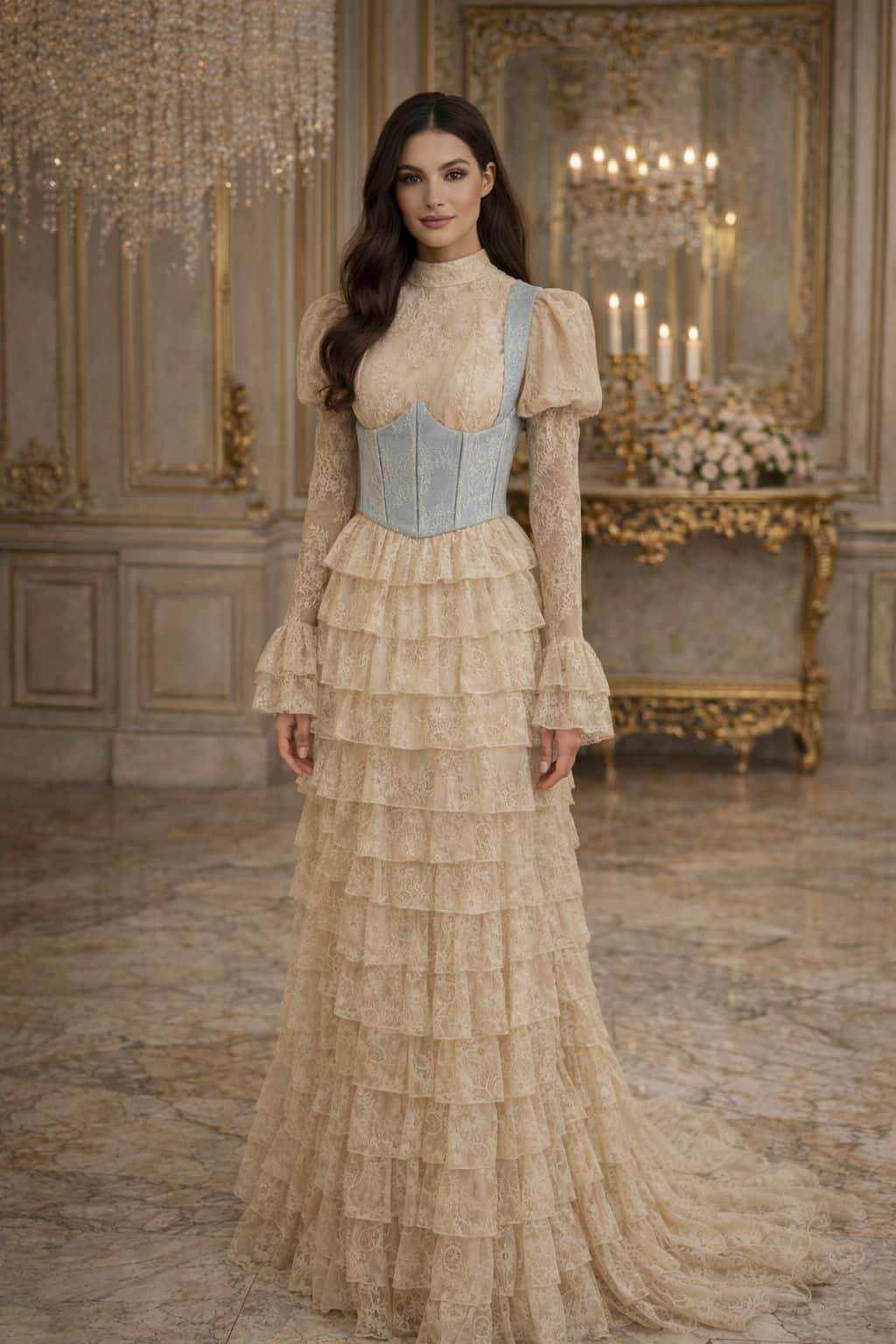 An ode to fiery elegance — Carmen Rouge captivates with cascading lace tiers, romantic bell sleeves, and a sculpted black corset that defines the silhouette with passion and strength. A dress born from art, music, and the timeless spirit of the muse.