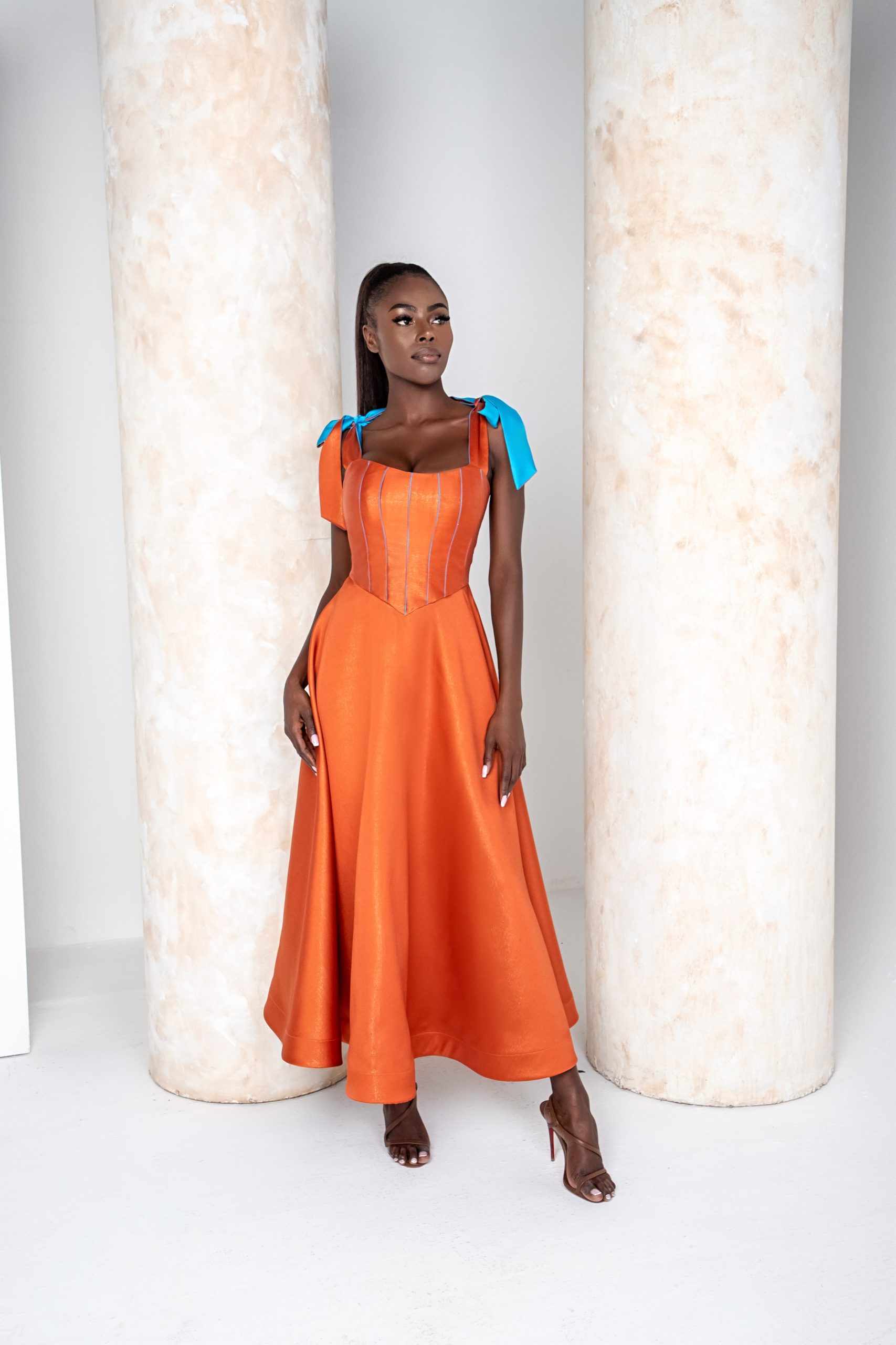 In the realm of elegance, there exists a midi dress that captures the essence of celestial beauty. Its sleeveless design, like a canvas awaiting the painter’s touch, invites the gentle caress of the breeze. Adorning the bodice is a corset, intricately crafted with delicate cuts that sculpt a silhouette akin to a blooming rose. Each curve, a testament to the artistry of the dressmaker, whispers tales of grace and allure. The colors, a divine fusion of sky blue and conduit red, dance together in harmony, weaving a tapestry of opulence and sophistication. The sky blue, reminiscent of a clear summer day, imbues the dress with an ethereal quality, while the conduit red, like the blush of a rose at dawn, adds a touch of passion and grandeur. As the wearer steps into the spotlight, she embodies the epitome of regal elegance, a vision of beauty that captivates hearts and enchants souls. In this dress, she becomes a princess of unparalleled grace and charm, destined to reign over realms of splendor and admiration.