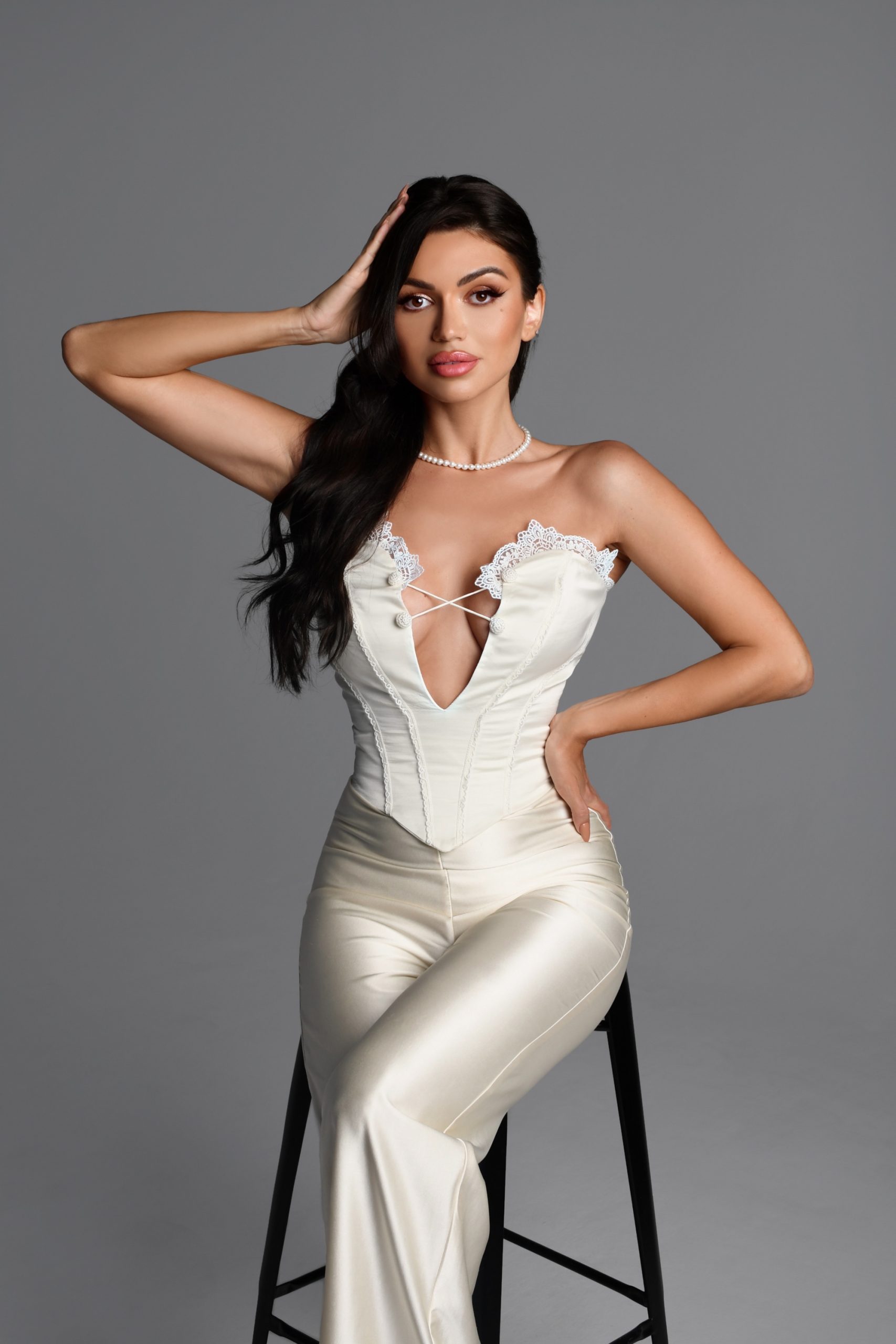A signature HHart silhouette, the intriguing corset showcases an elegant front design with straps and handmade crotchet buttons. Crafted in pure silk, it offers a vintage cut with strings at the back. The corset can be enhanced by tightening to further define the waist