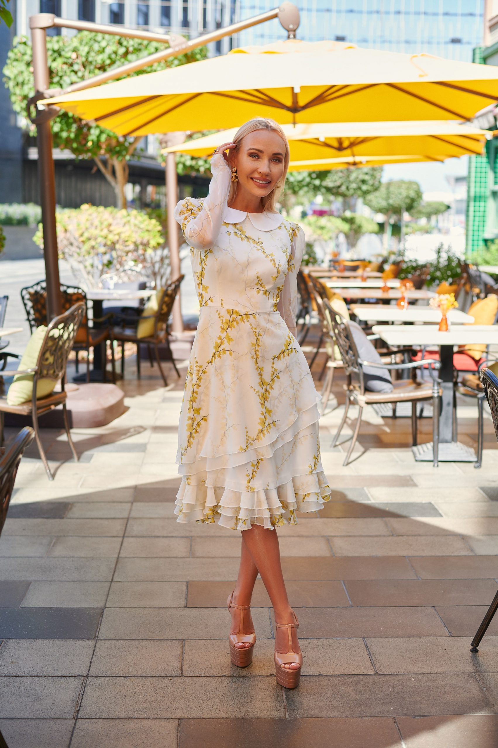 The white dress is crafted from an incredibly soft floral chiffon, embellished with a gradient-effect floral motif. Featuring long sleeves, a comfortable fit and an elegant ruffle on the hem, the dress is an essential summer piece.