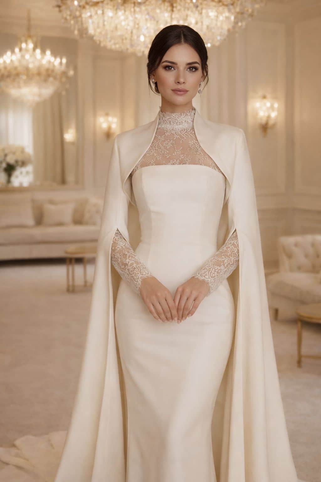 The Celestia Cape Gown is a celebration of timeless elegance and feminine strength. Designed with a sculpted silhouette that gently embraces the body, this couture piece highlights refined craftsmanship and delicate sophistication