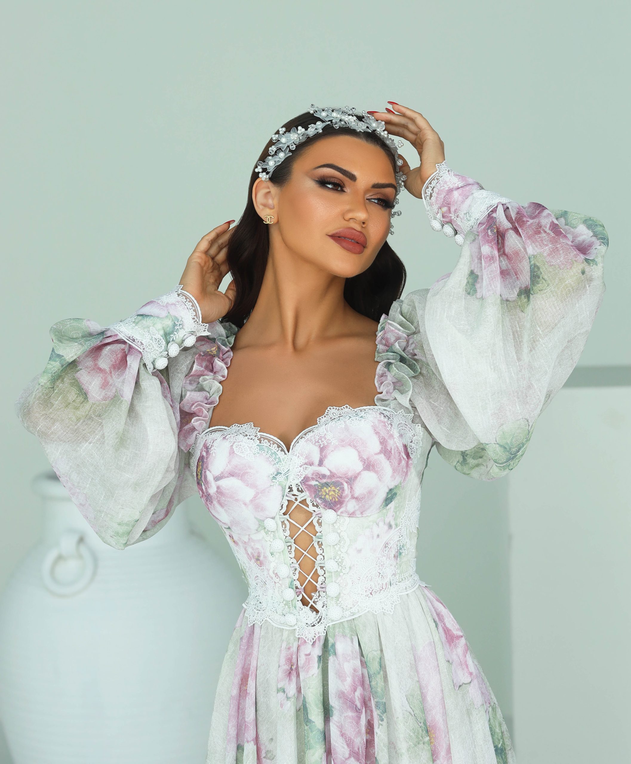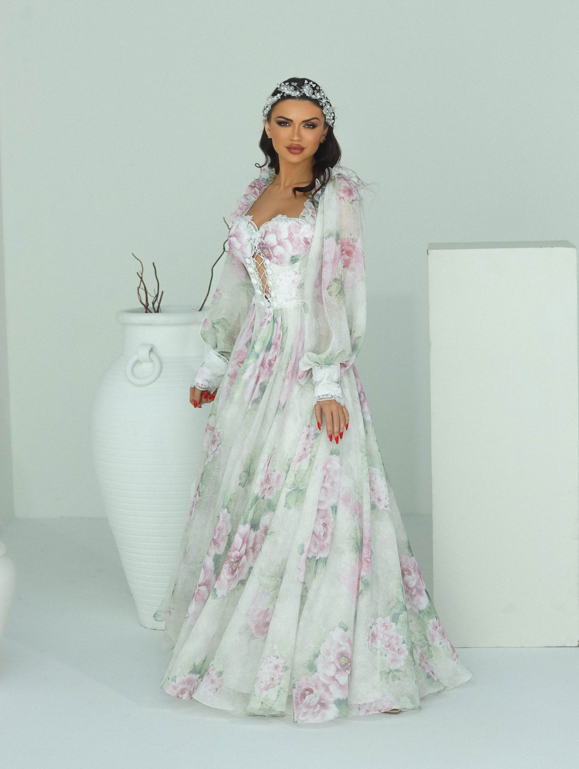 Fabric: Dress in floral linen, French laces and crochet buttons