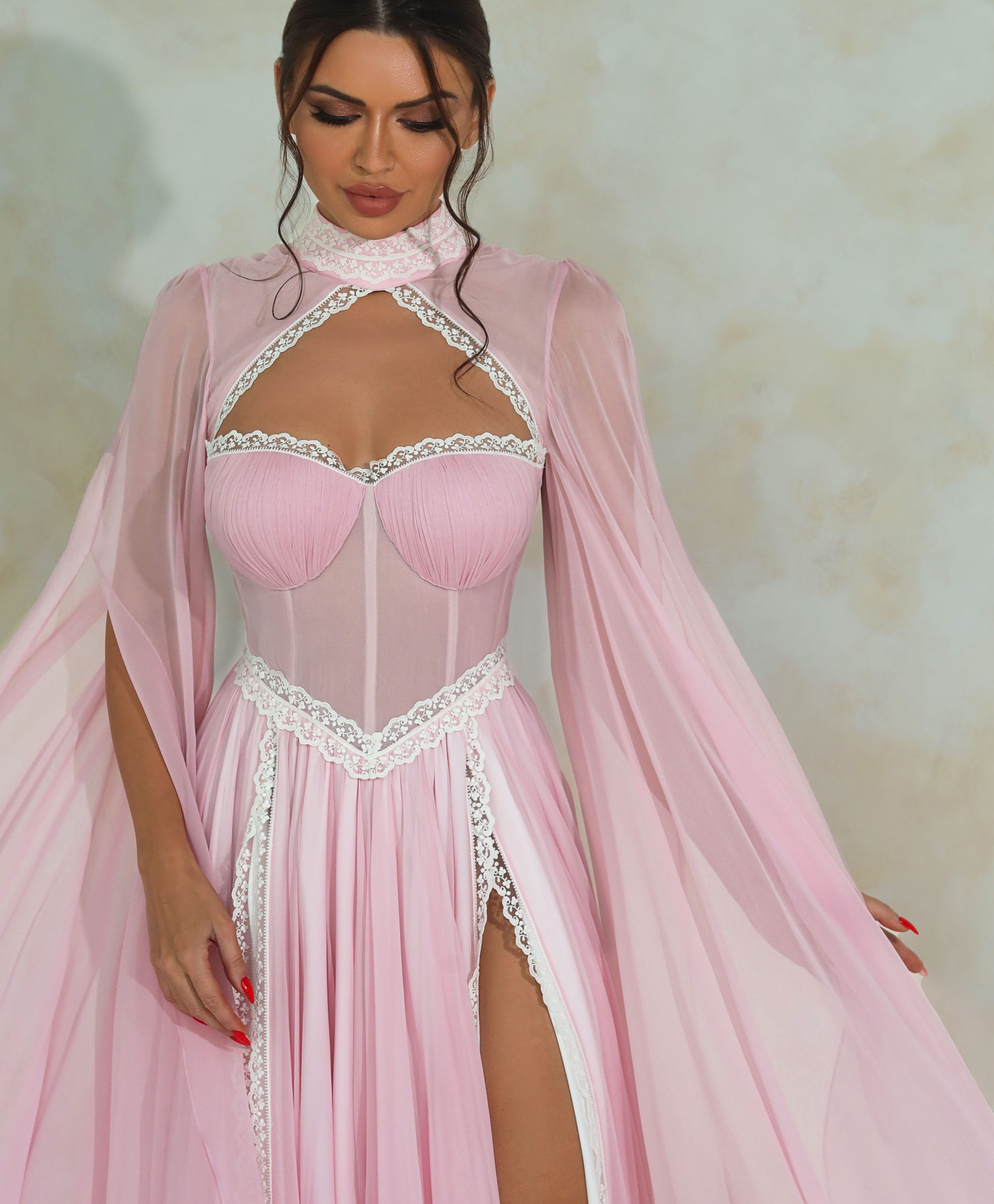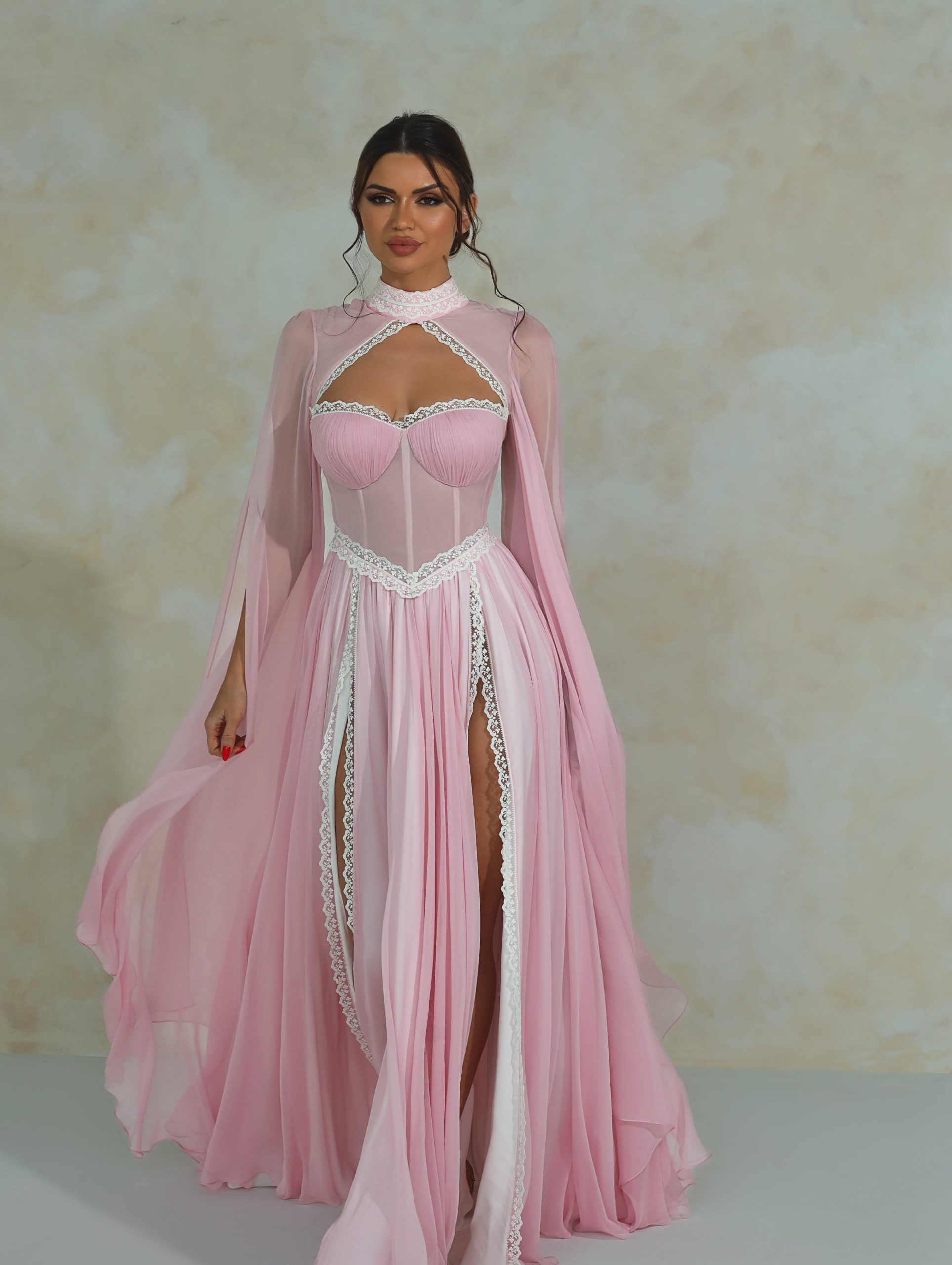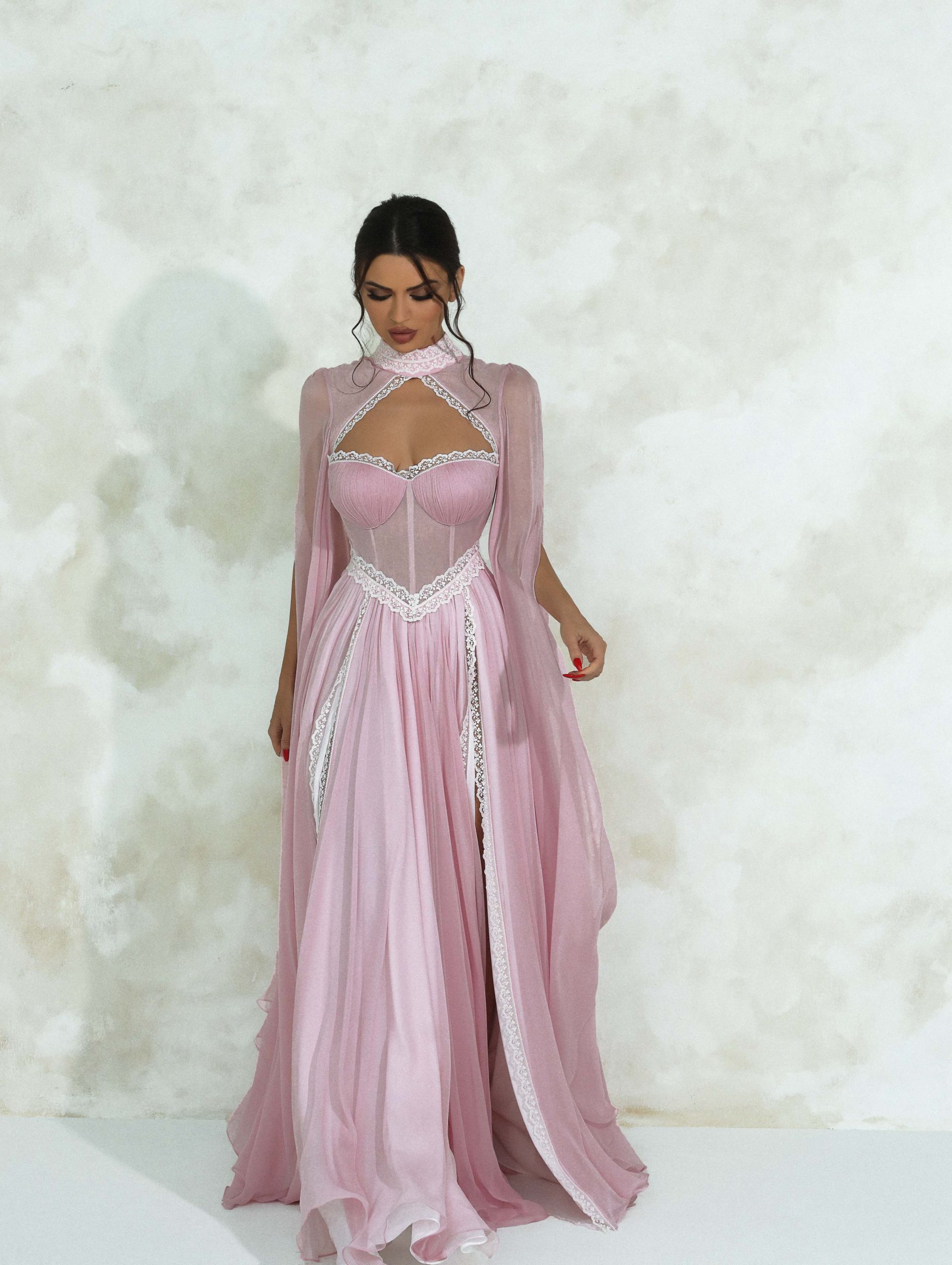 A true manifestation of divine beauty where silk, lace, and meticulous craftsmanship converge to create a masterpiece resonating with the majesty of a goddess. Crafted from lustrous pink silk georgette, this maxi ensemble features a corset waist cut and cupped bust both adorned with delicate French laces providing the ultimate feminine look. The interior luxury is heightened by a premium silk lining to ensure softness with every motion.