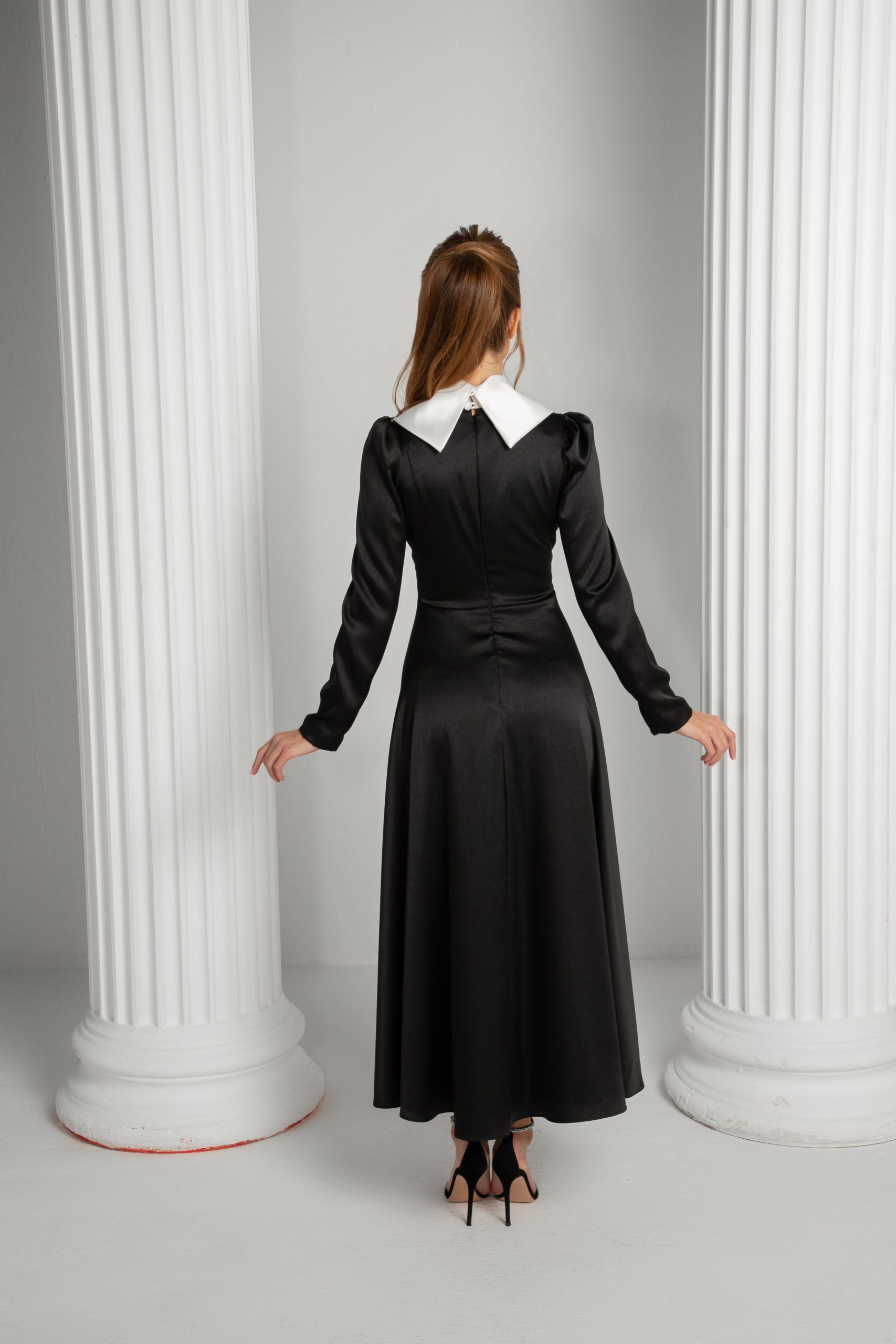 A dress of timeless elegance and whimsical charm, this black masterpiece enchants with its striking white collar that cascades gracefully to the waist, where it concludes in a dainty, enchanting bow. Every detail is crafted to evoke the magic of a fairytale, from the flowing silhouette to the delicate contrast of monochrome hues.