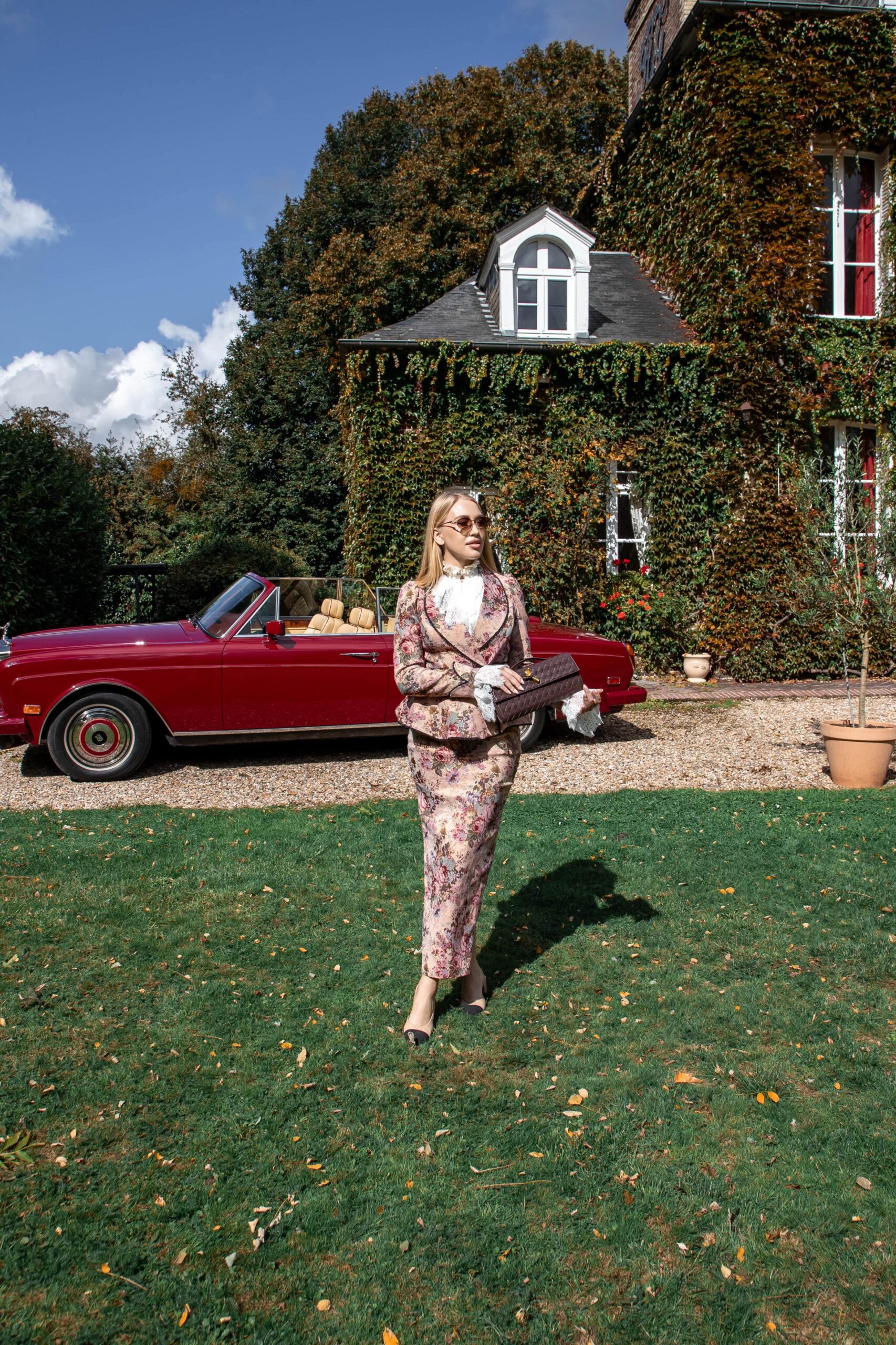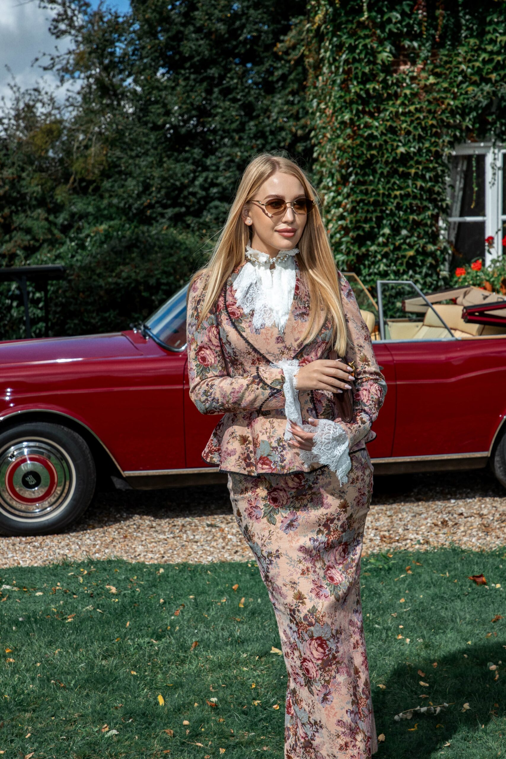 A tailored floral jacket with a peplum cut, detailed with black trimming and lace cuffs — a statement of vintage refinement.