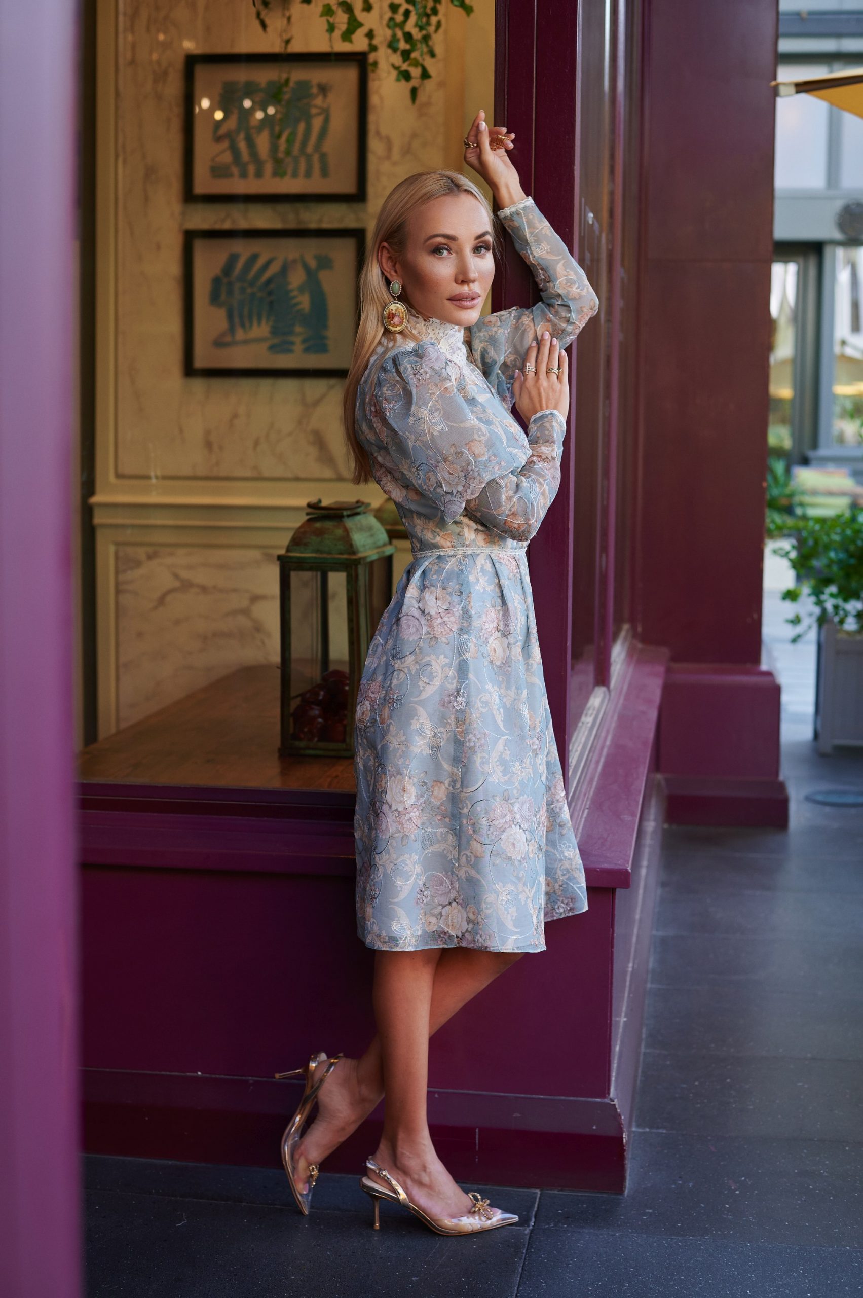 The blue floral linen dress pays tribute to the HHart heritage with a tonal embroidered vintage motifs. The long sleeved dress can be your perfect fairy day.